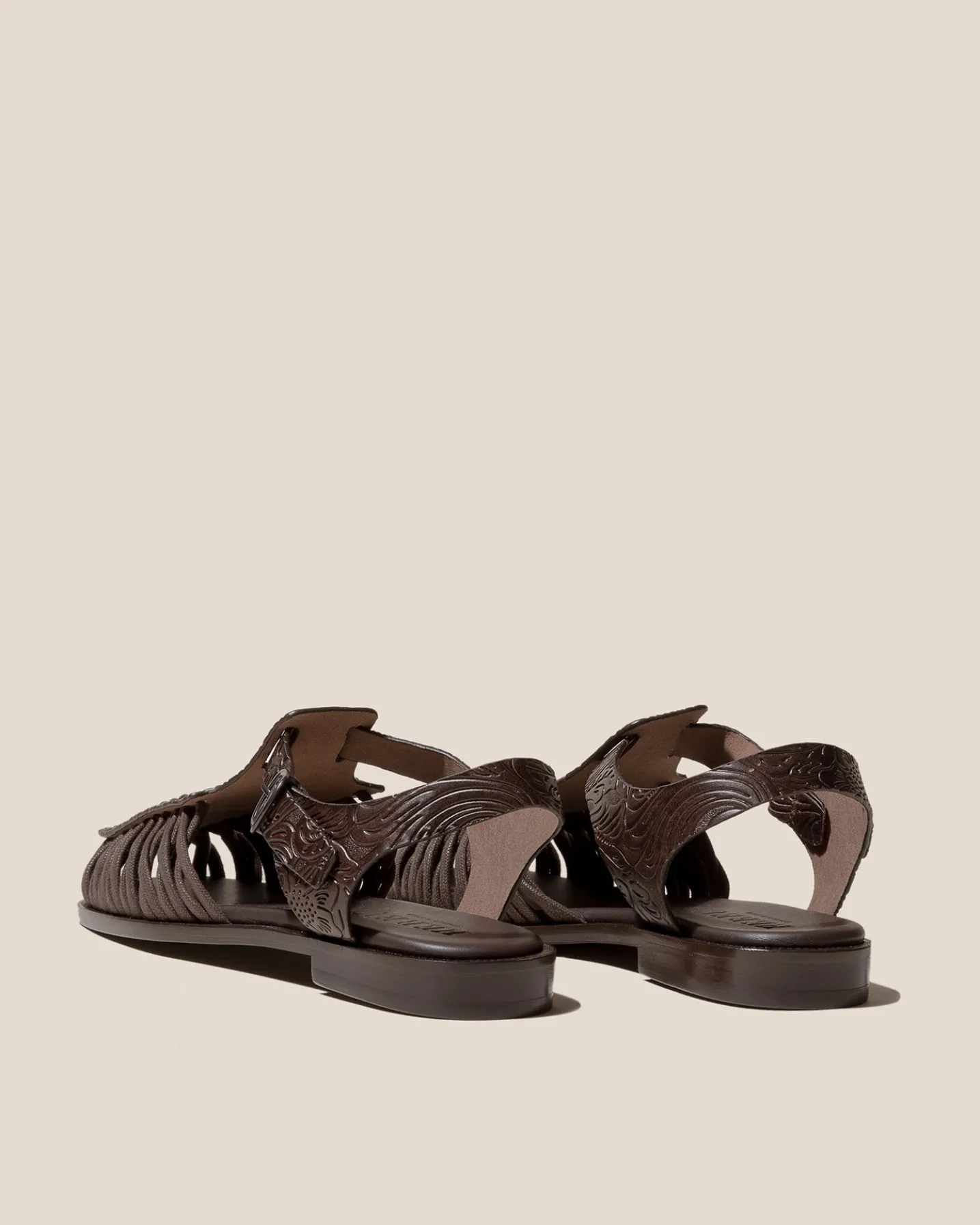 Square toe T-bar sandal with caged sides, crafted in embossed veg-tanned calf leather.