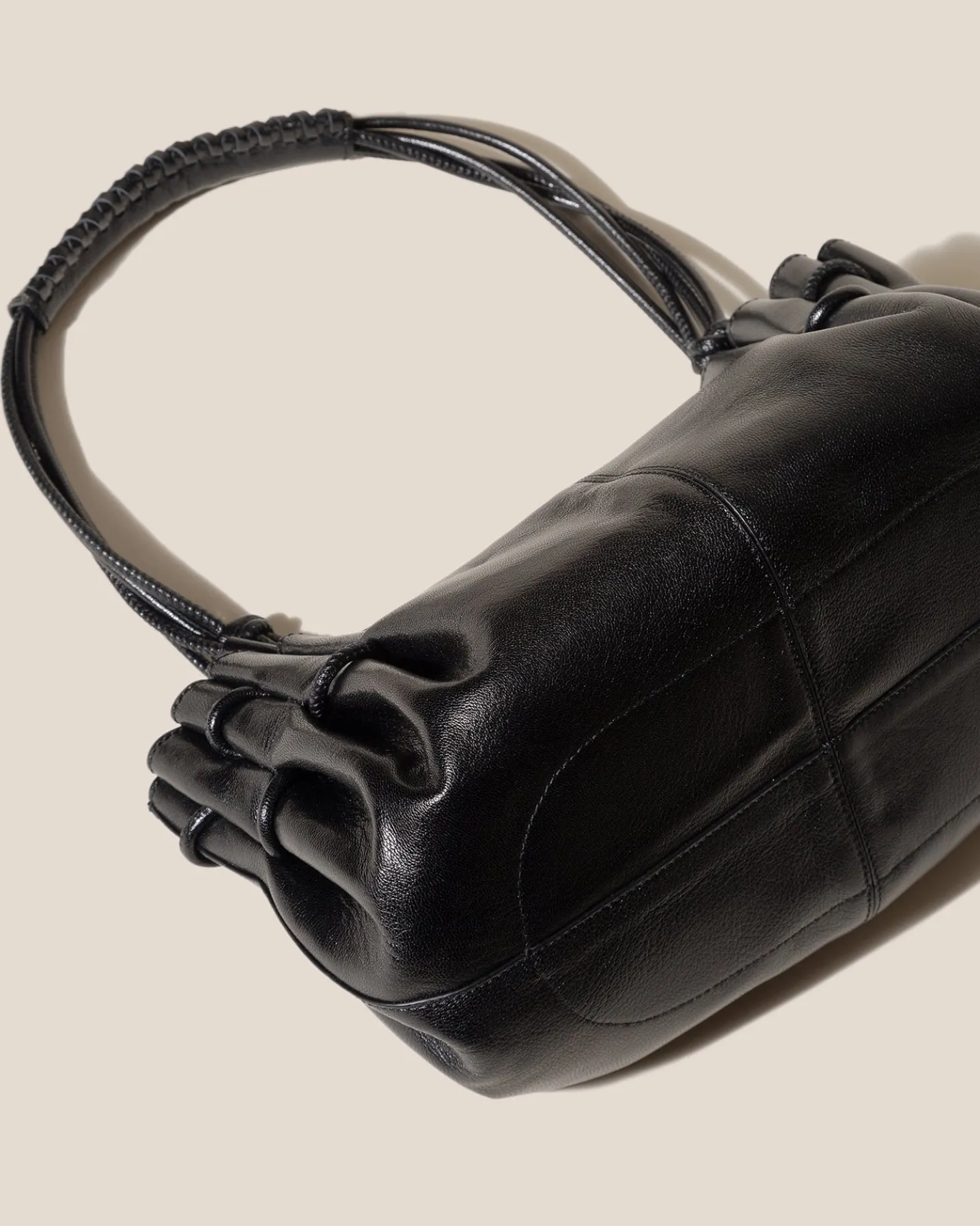 Pleated hand/shoulder bag crafted in supple shiny lambskin.