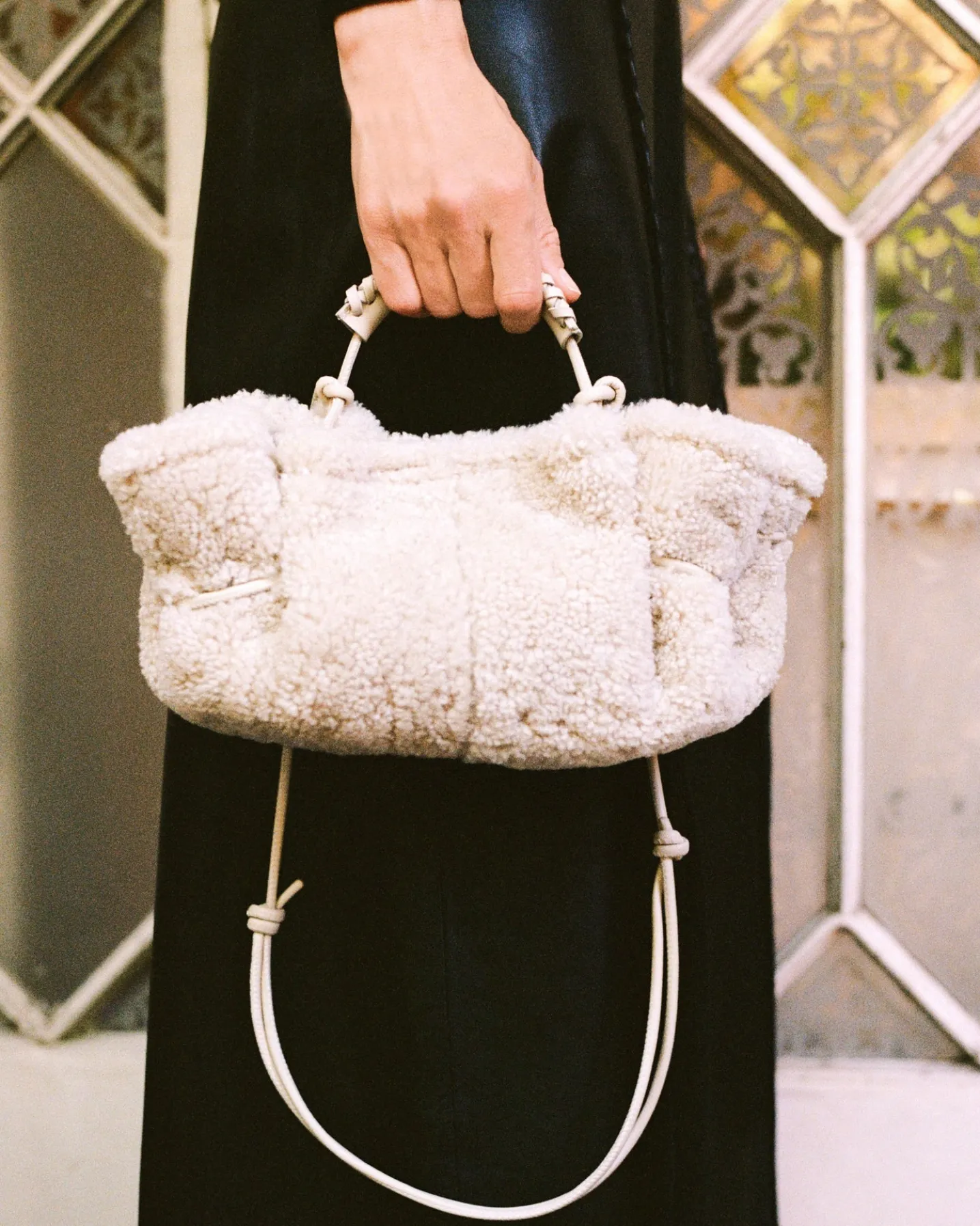 Small pleated crossbody / handbag crafted in shearling lambskin.