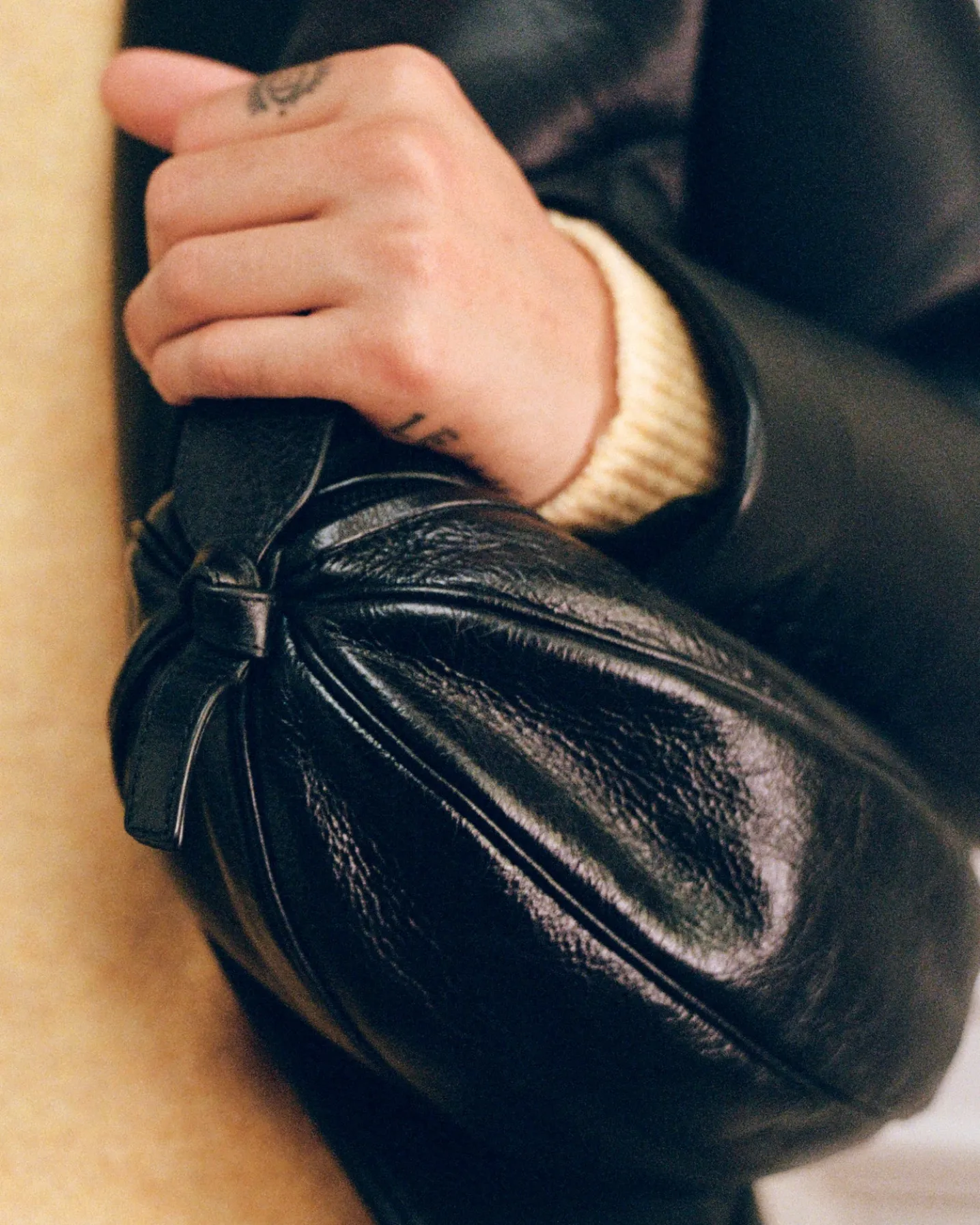 Large elongated ball-shape crossbody bag with knotted side details. Crafted in distressed calf leather and lined with organic cotton canvas.
