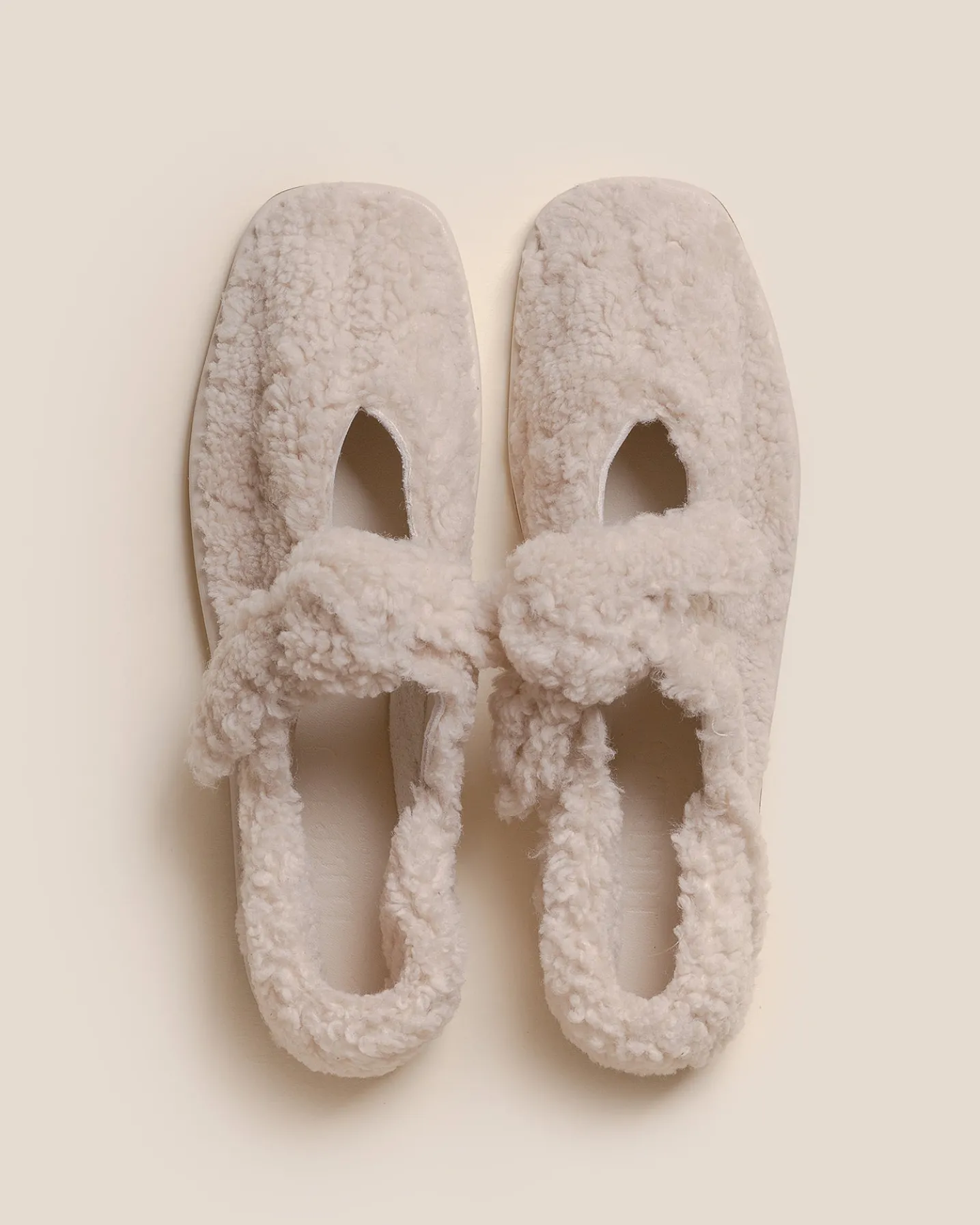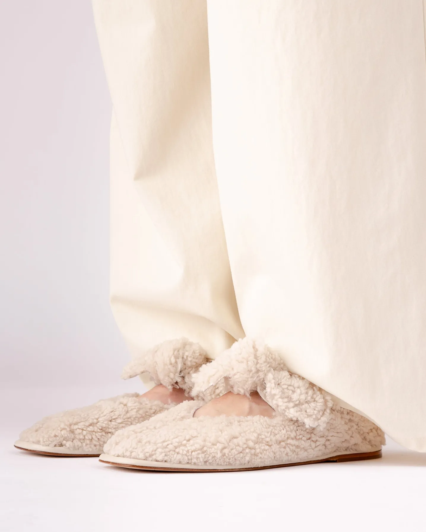 Square toe pump with bow detail, crafted in curly shearling lambskin.