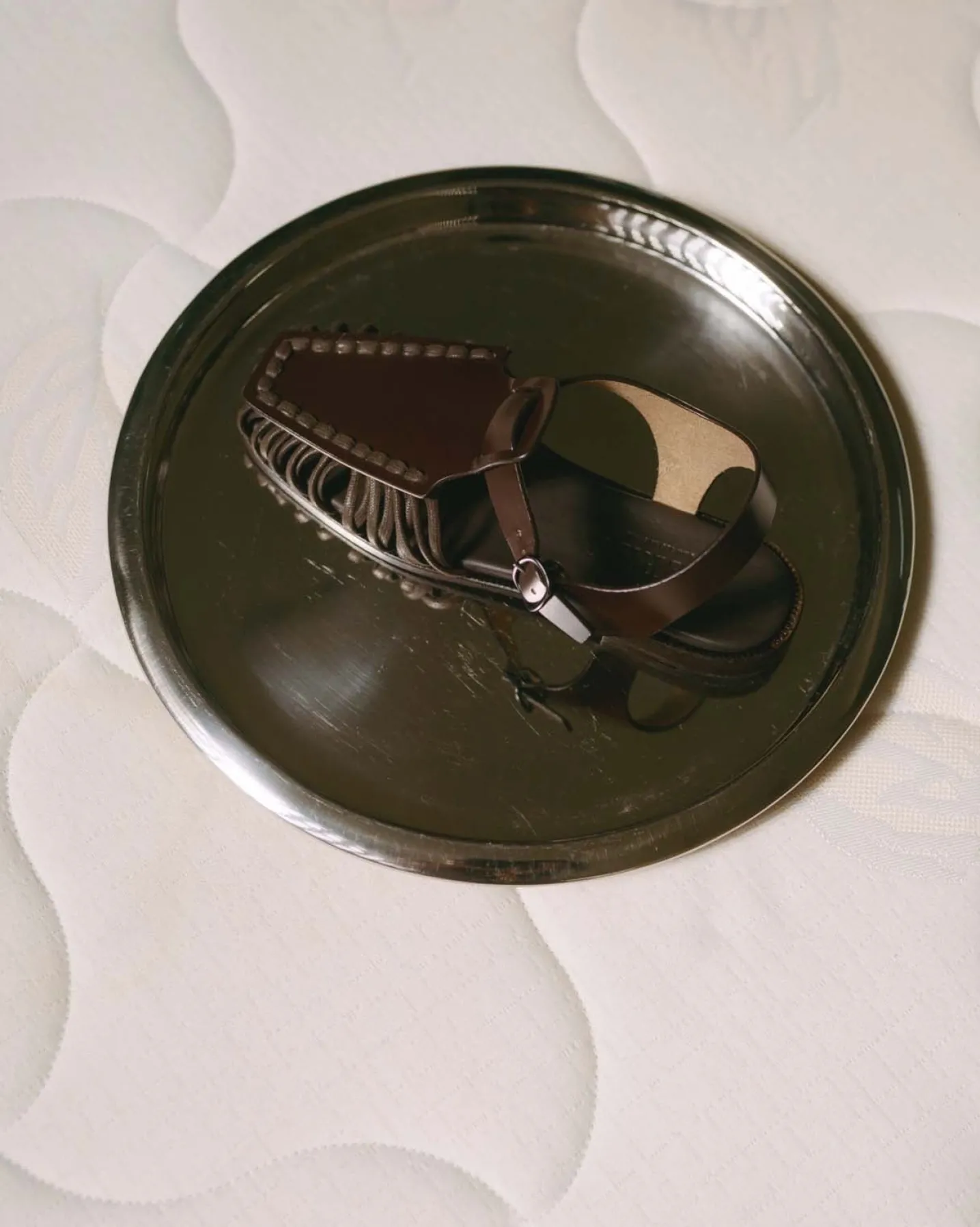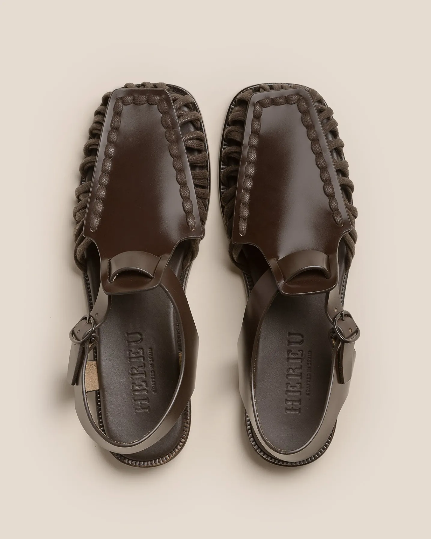 Square toe T-bar sandal with caged sides.