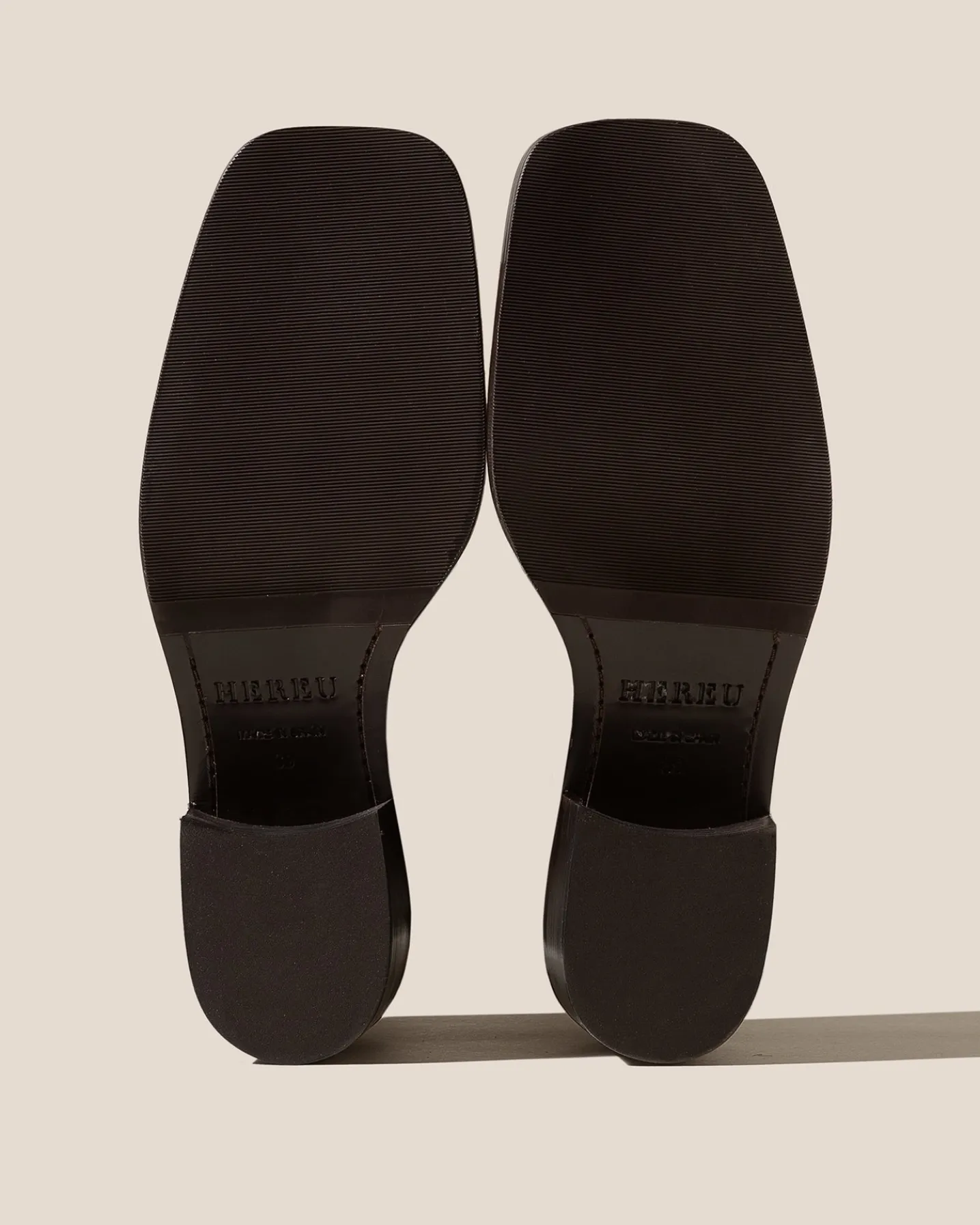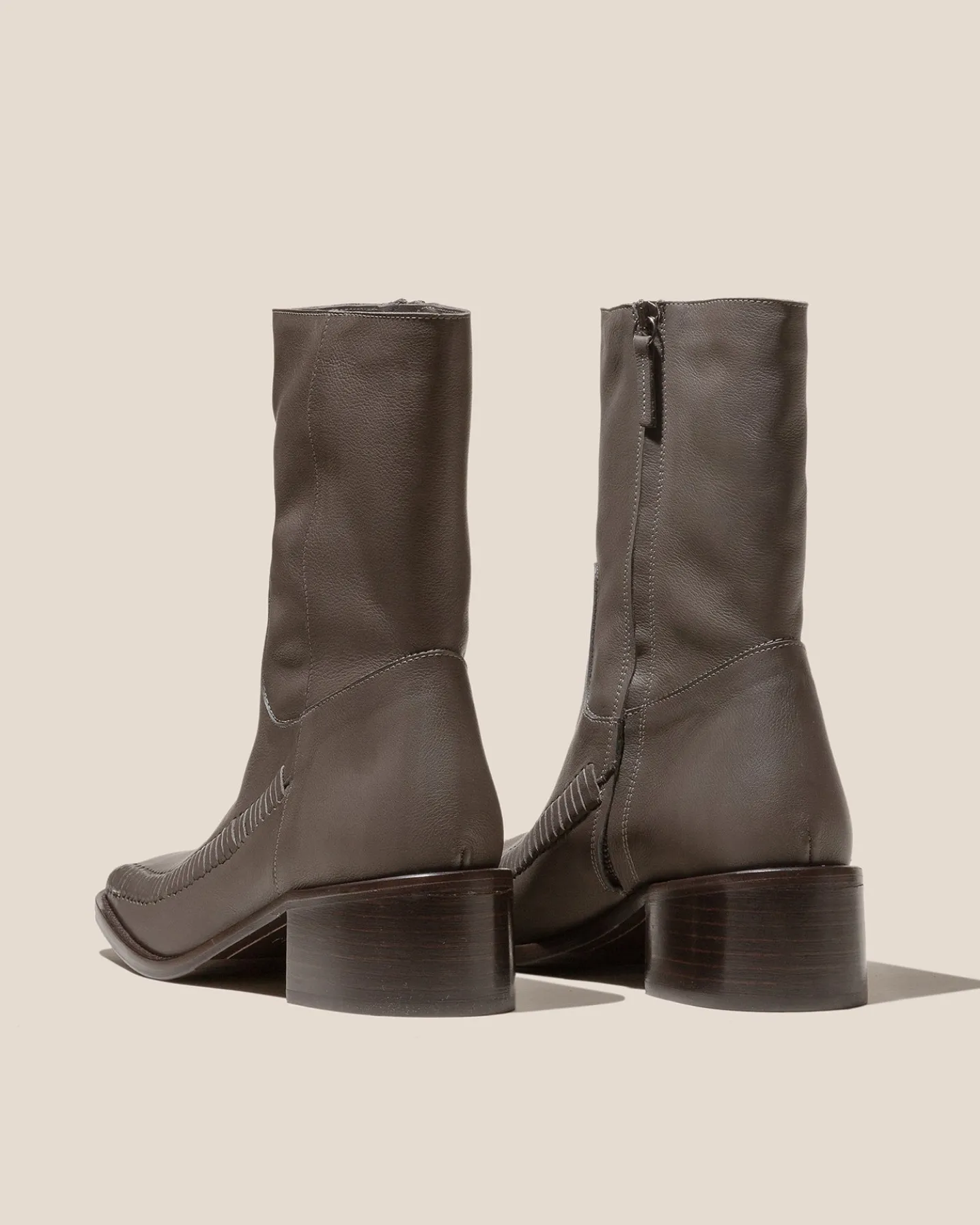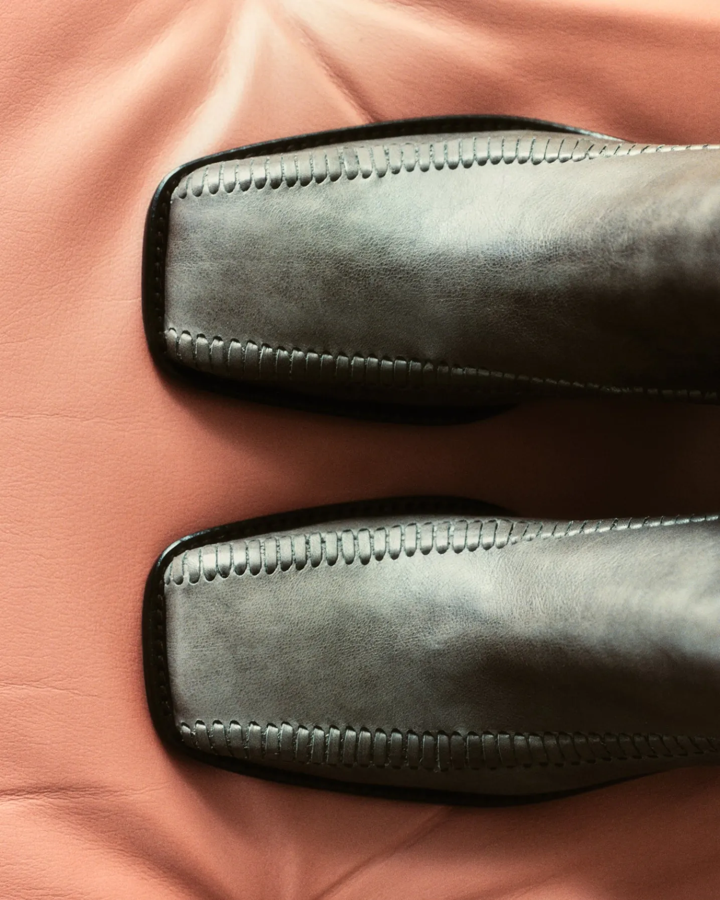 Square toe ankle boot with braided details, crafted in sheeny soft calf leather. The outsole is stitched to the upper for extra flexibility and durability.