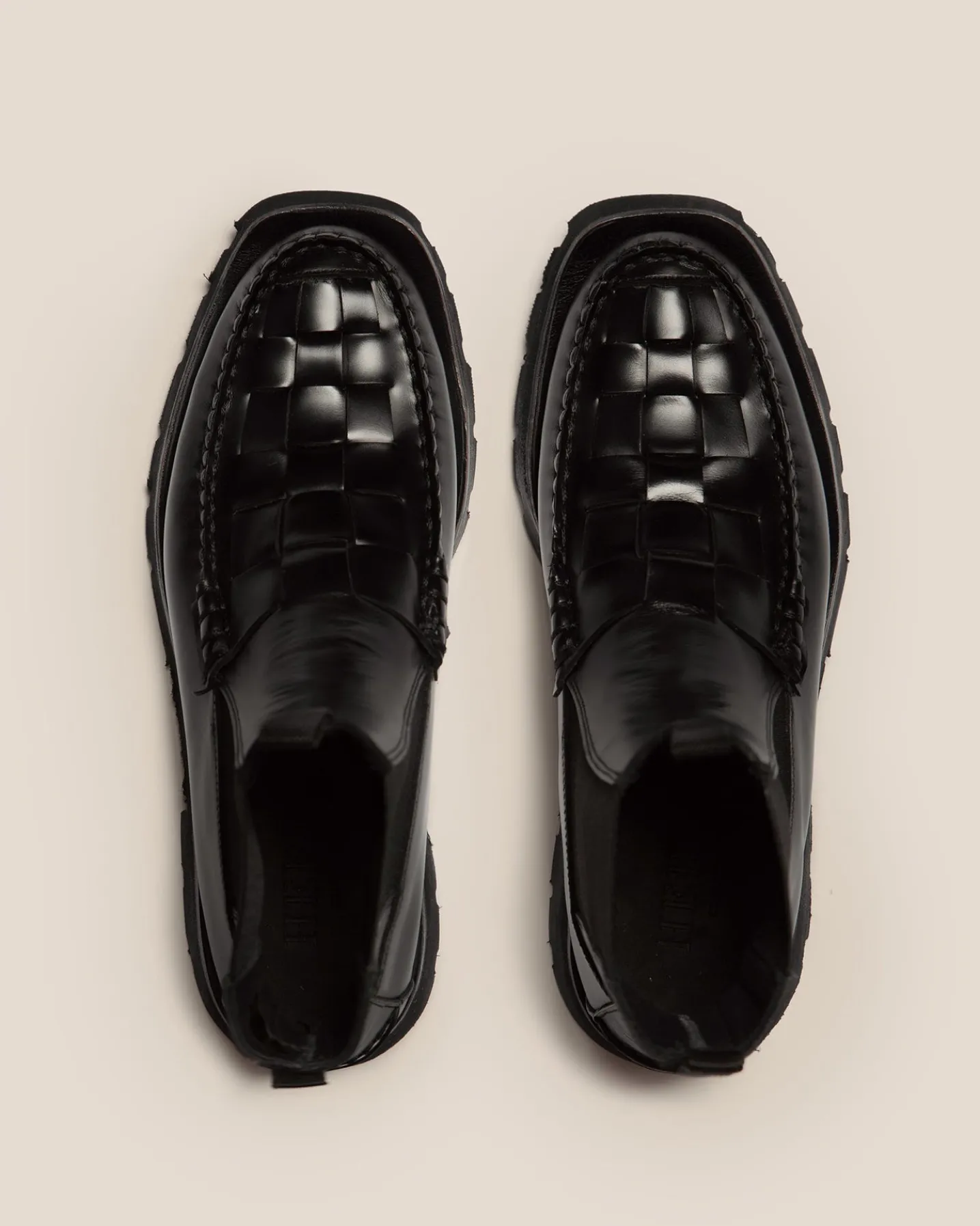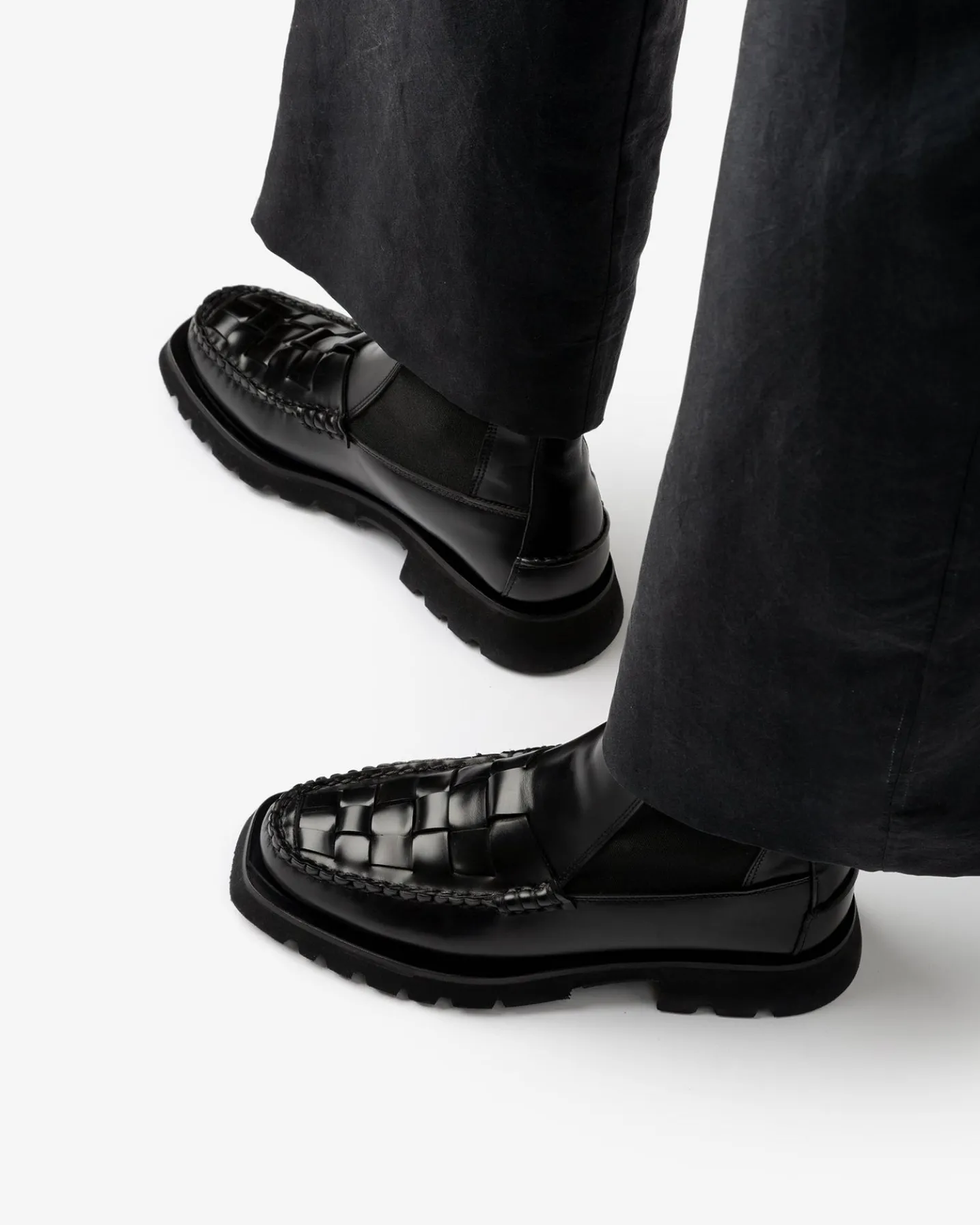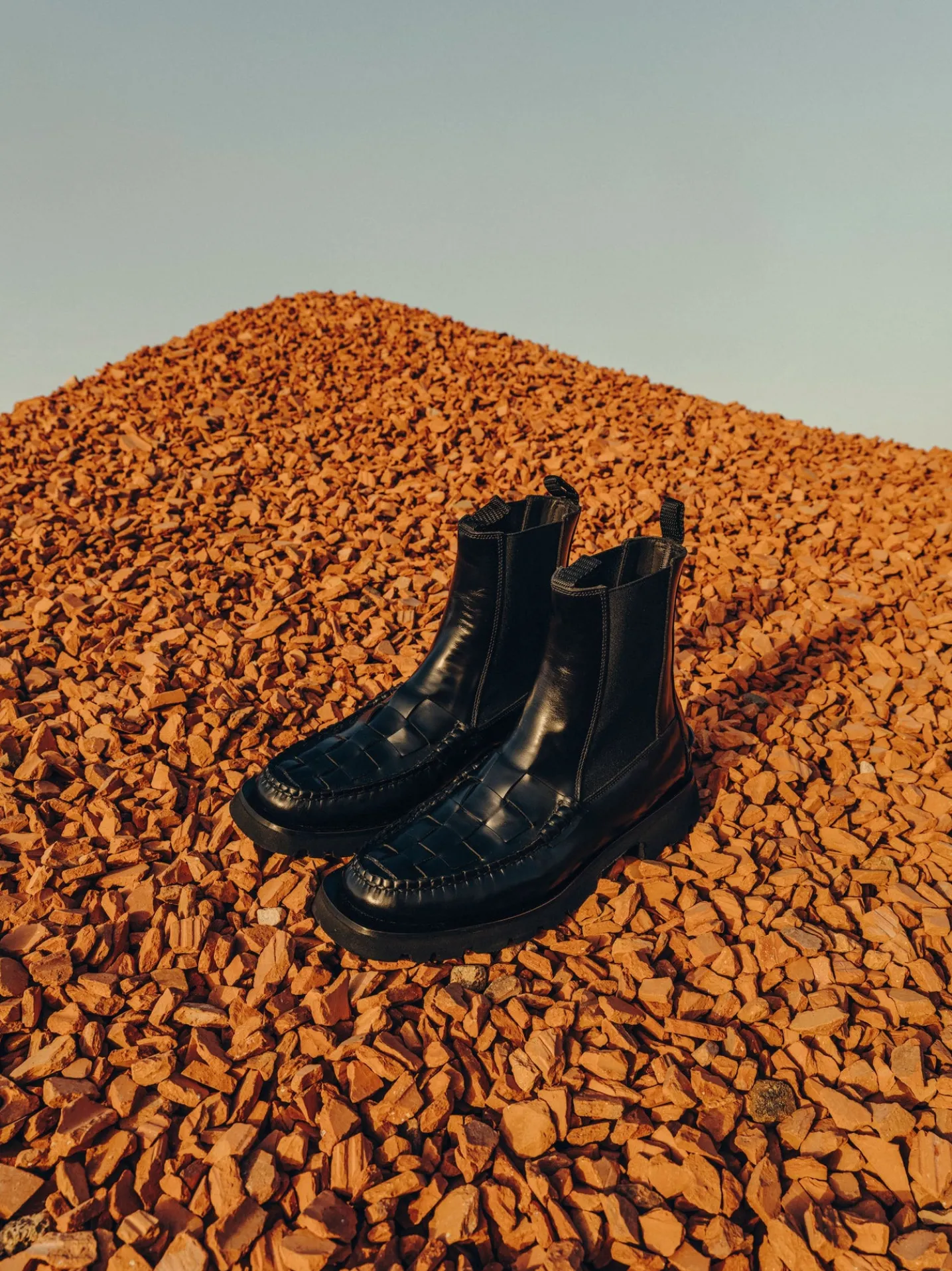 Mid-calf Chelsea boot with interwoven front detail. Crafted in Spanish full-grain leather and lined in calf leather. Hand sewn using the traditional moccasin construction.