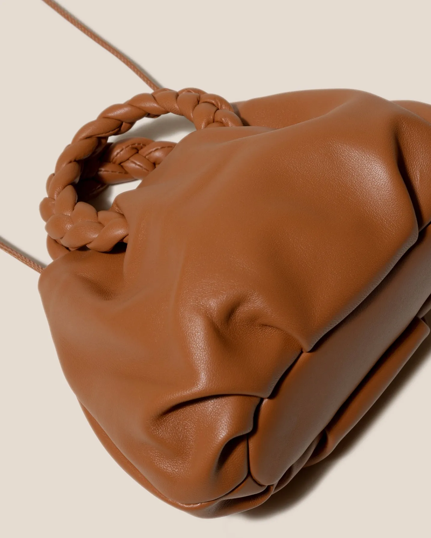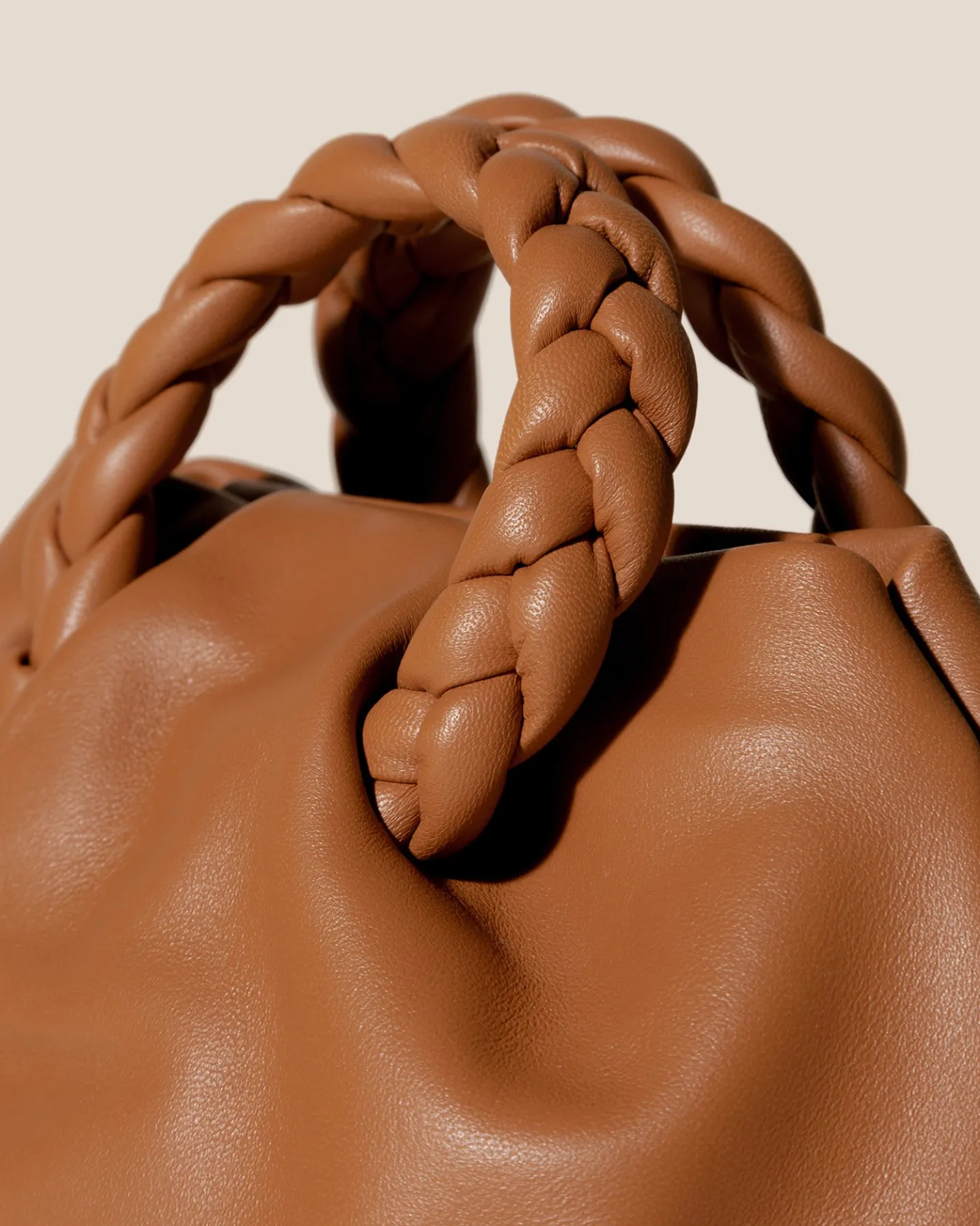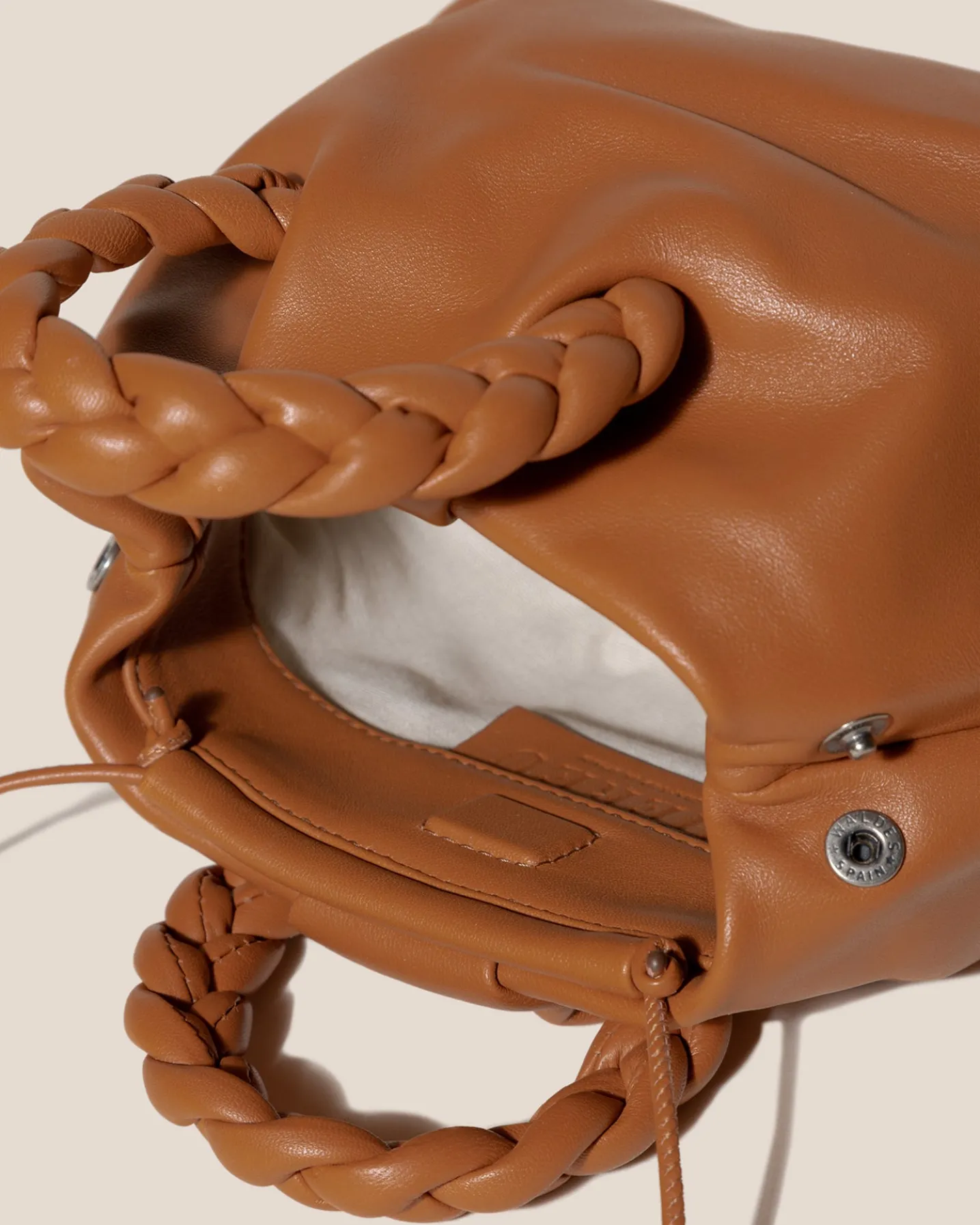 Small leather tote with braided leather handles, crafted in supple lambskin lined with organic cotton canvas.