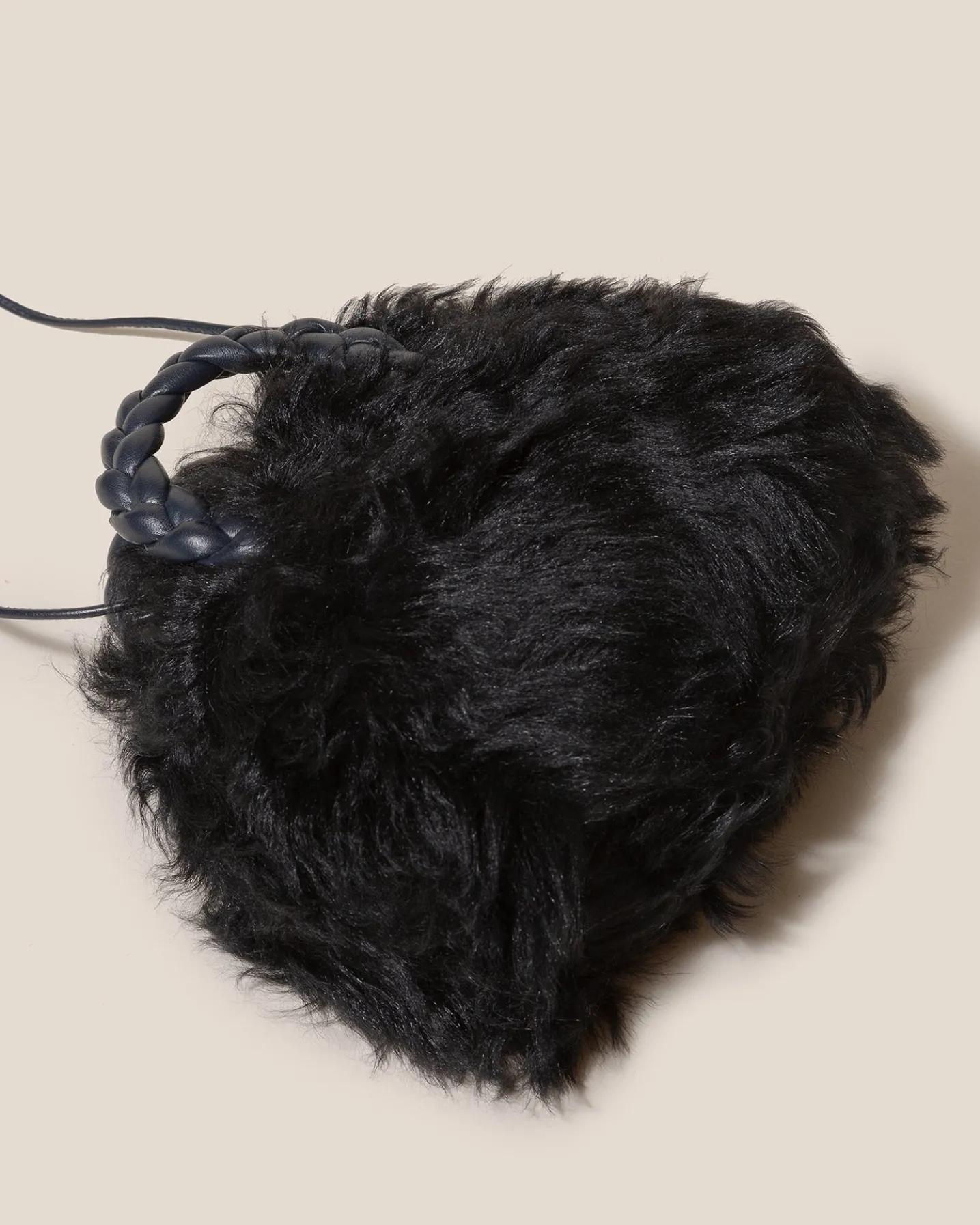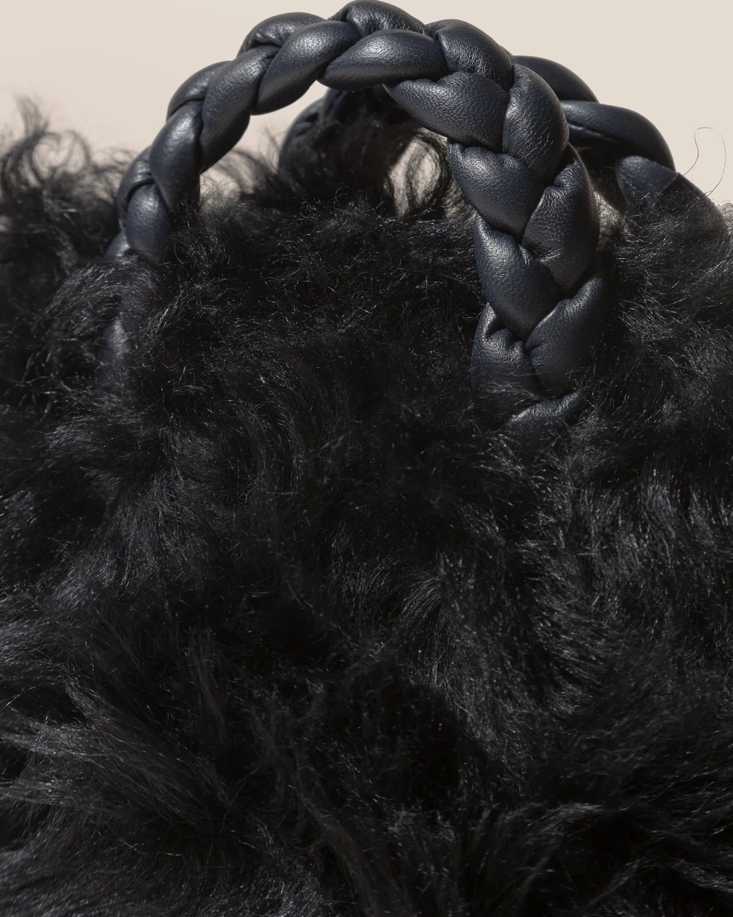 Small crossbody bag with braided leather handles, crafted in long hair shearling sheepskin and supple lambskin.