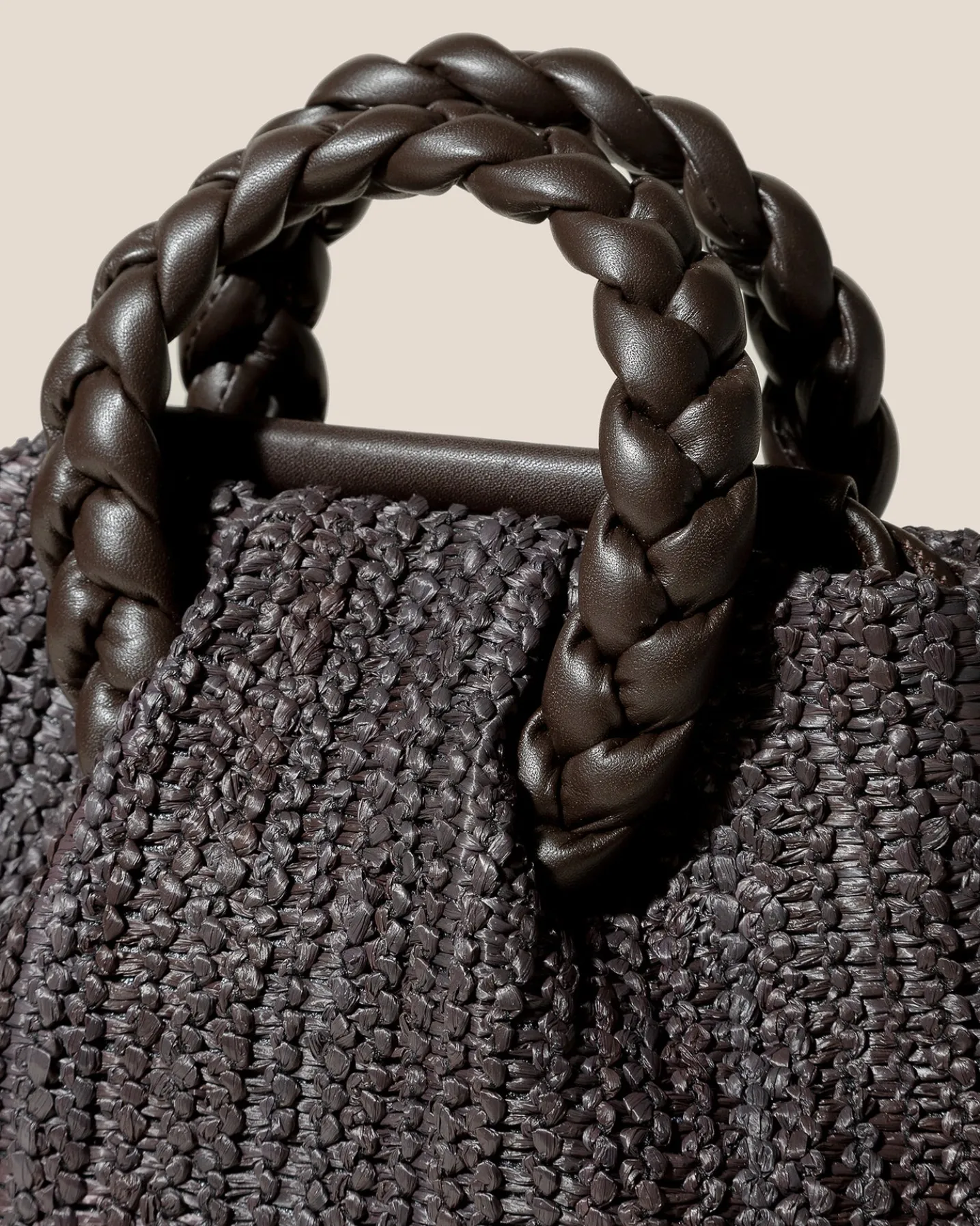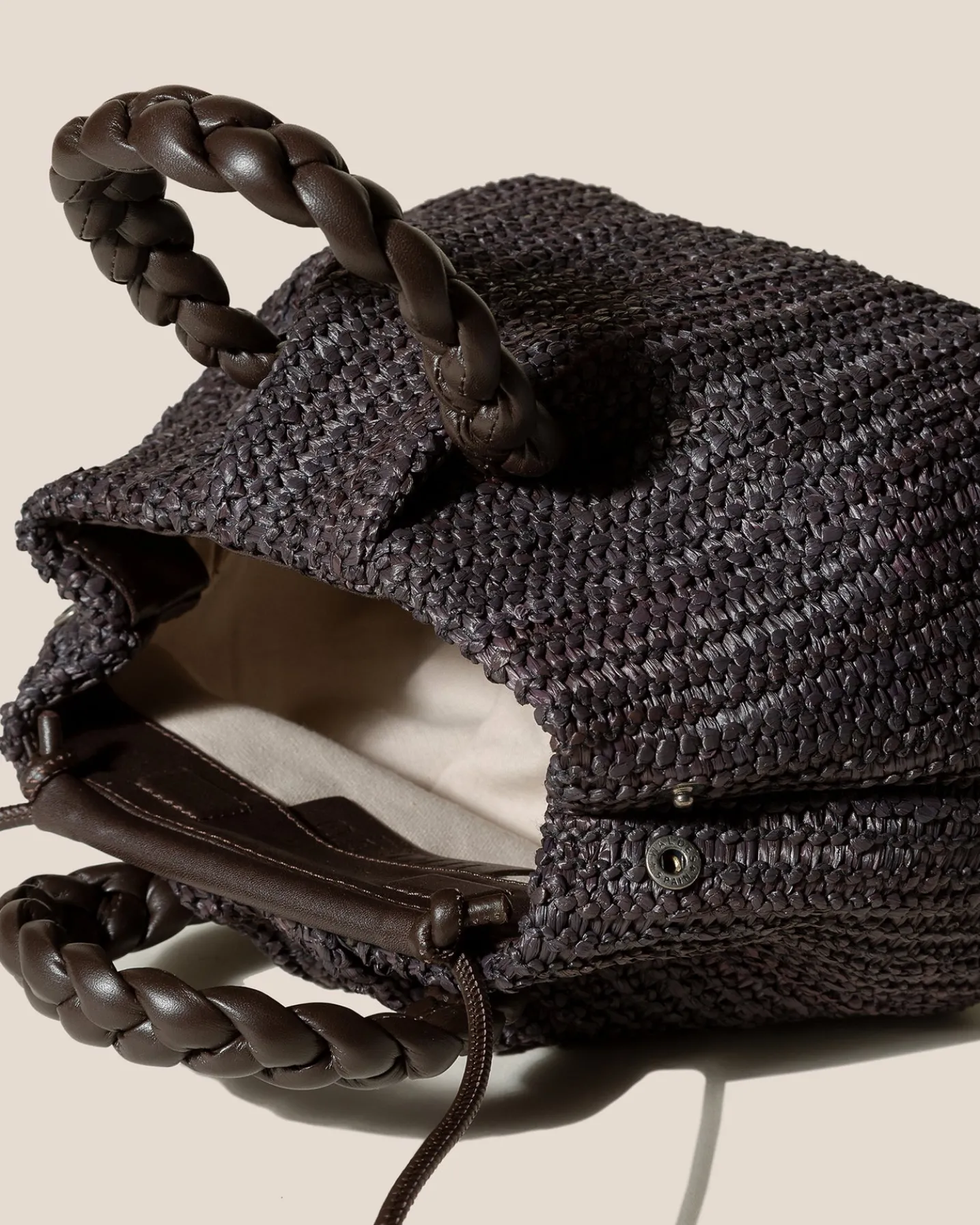 Mediumraffiatote with braided leather handles, lined with organic cotton canvas.