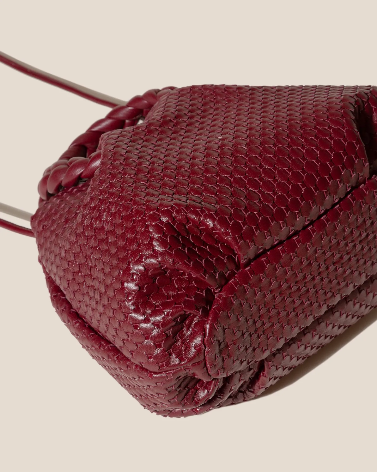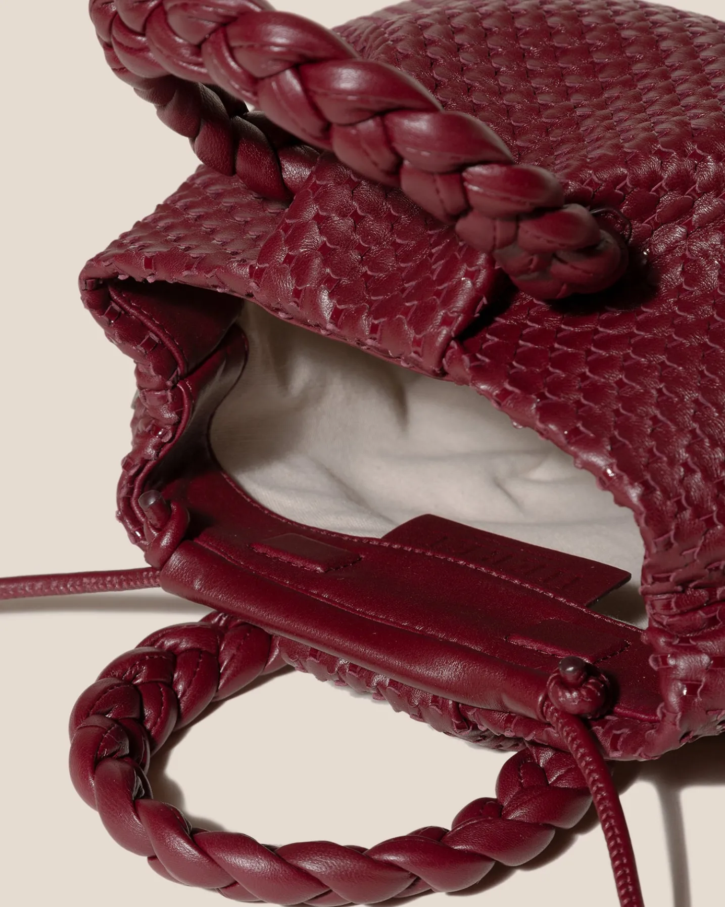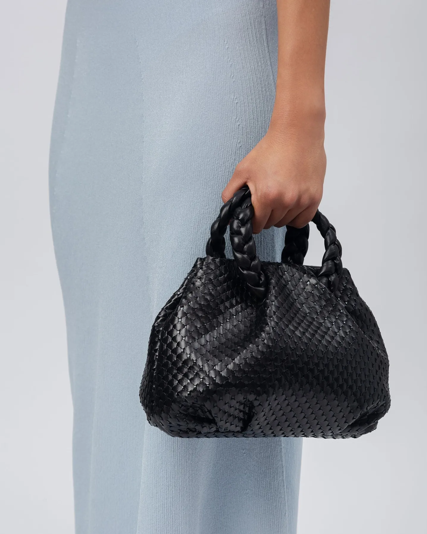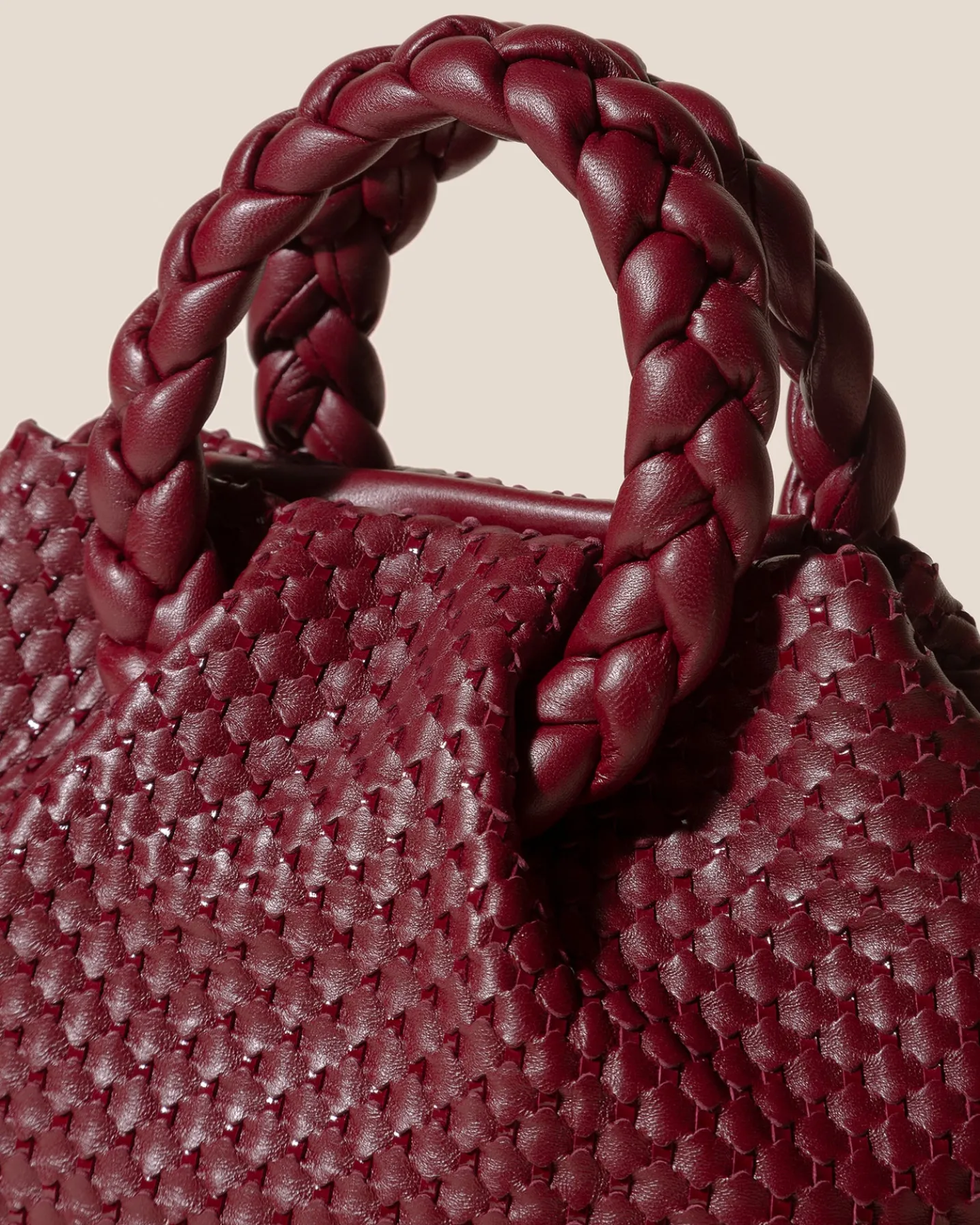 Medium leather tote with braided leather handles, crafted in interlaced calf leather lined with organic cotton canvas.