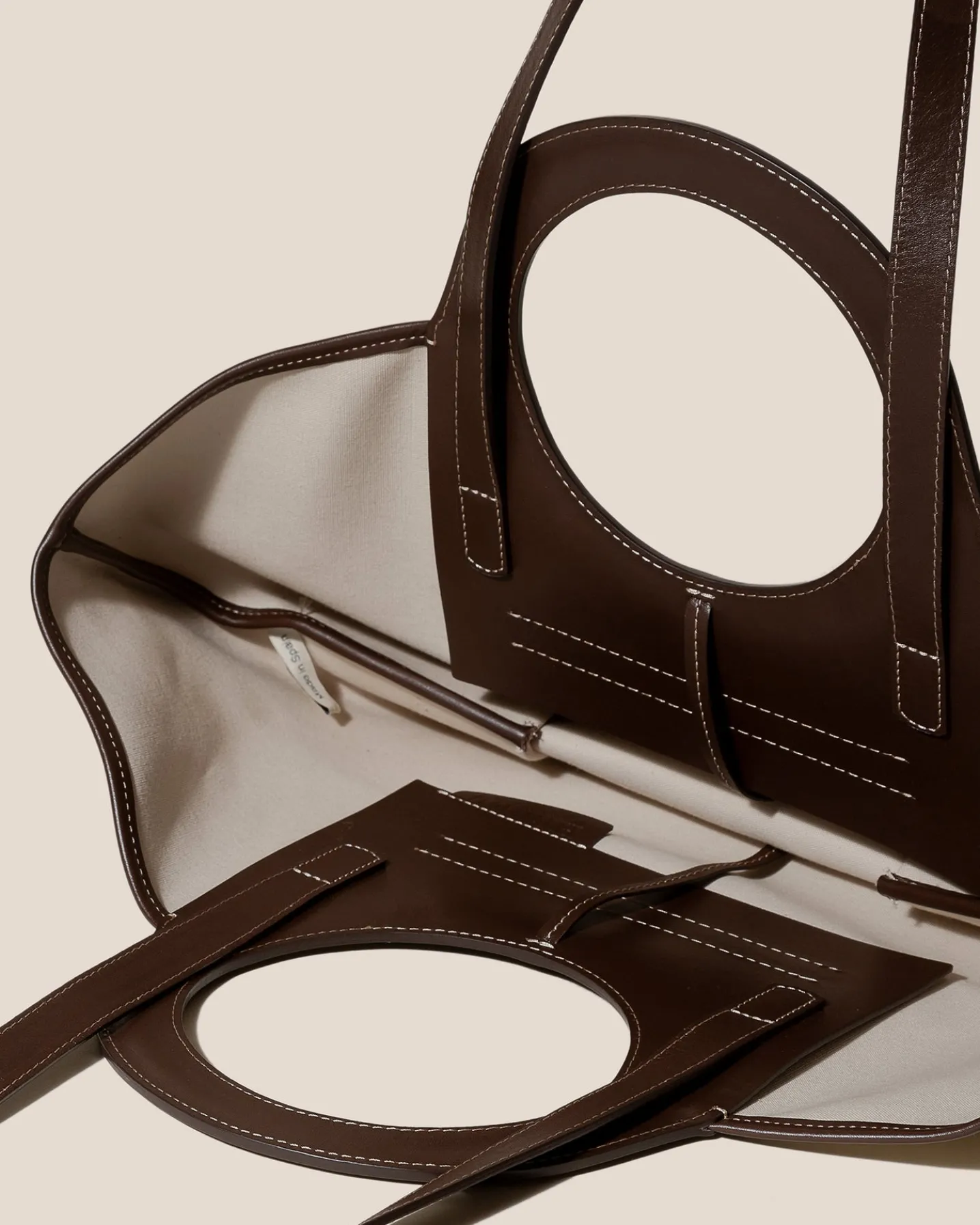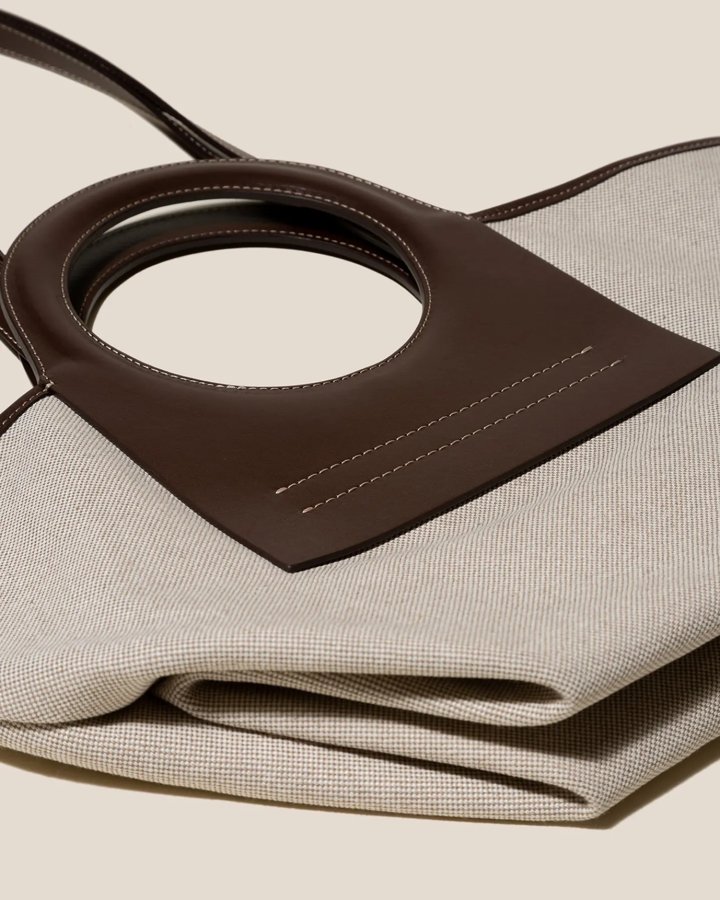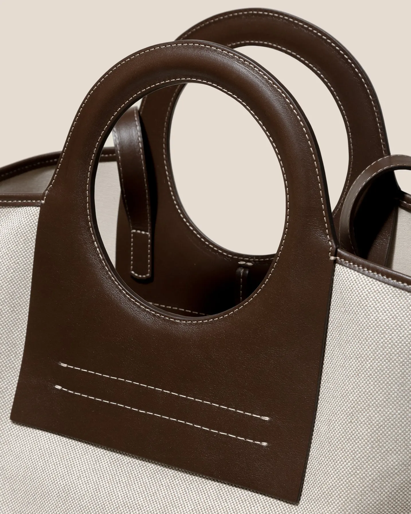 Tote bag constructed from organic textured premium canvas and trimmed with calf leather.