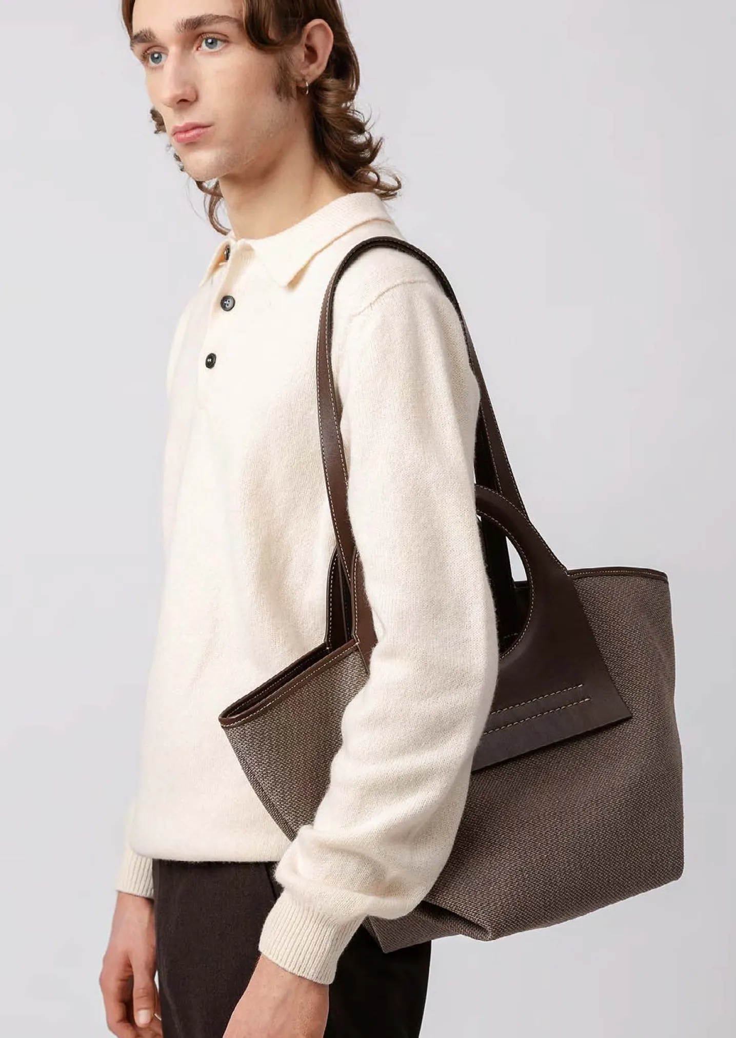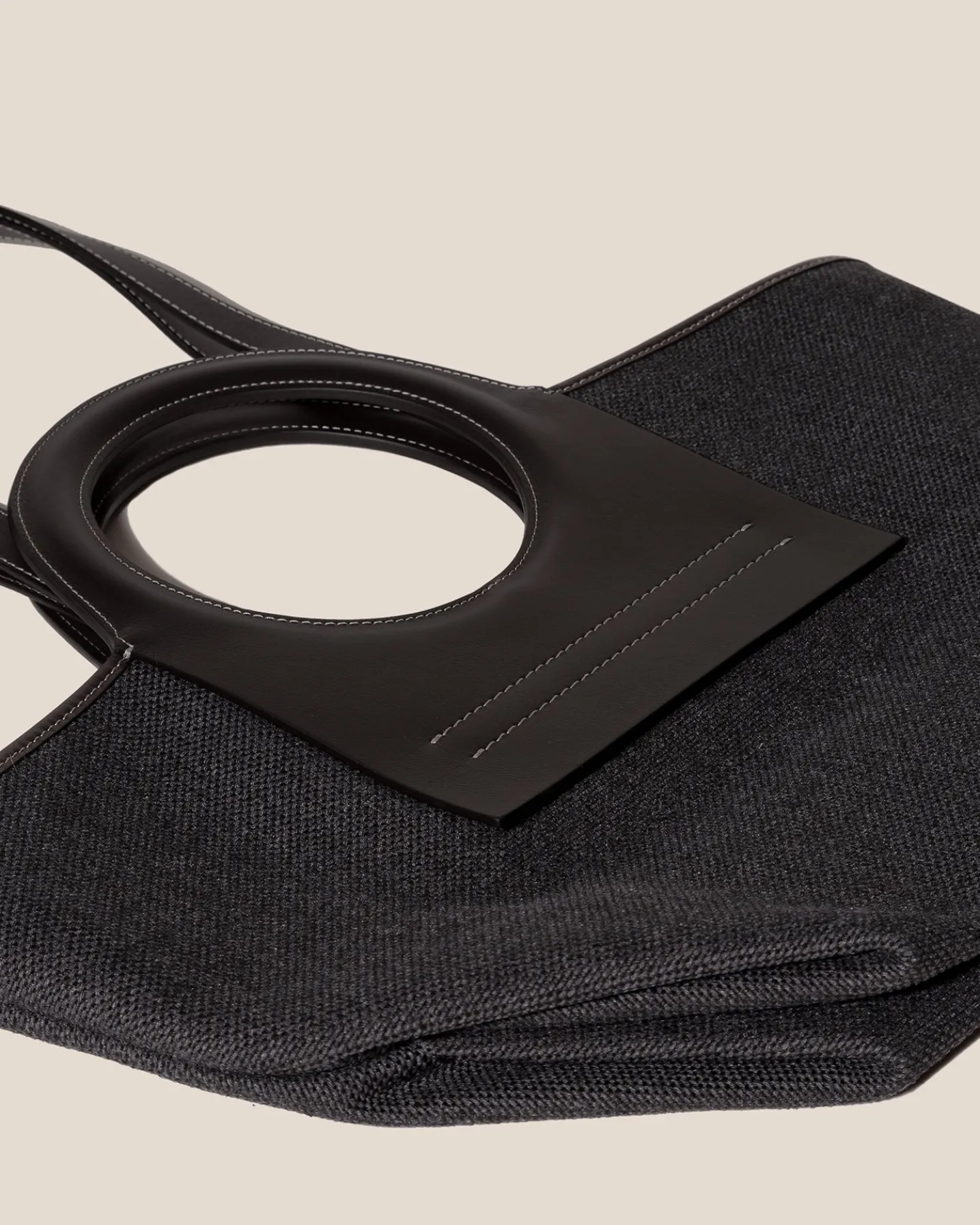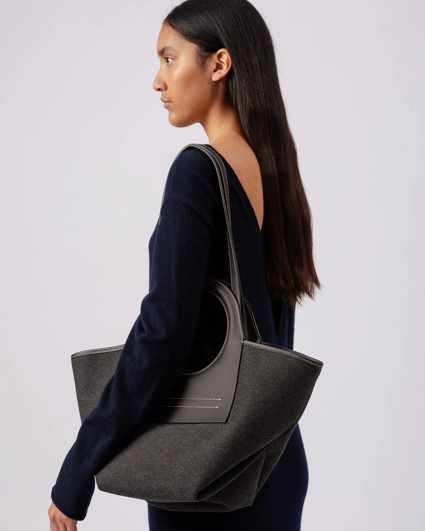 Tote bag constructed from organic textured premium canvas and trimmed with calf leather.