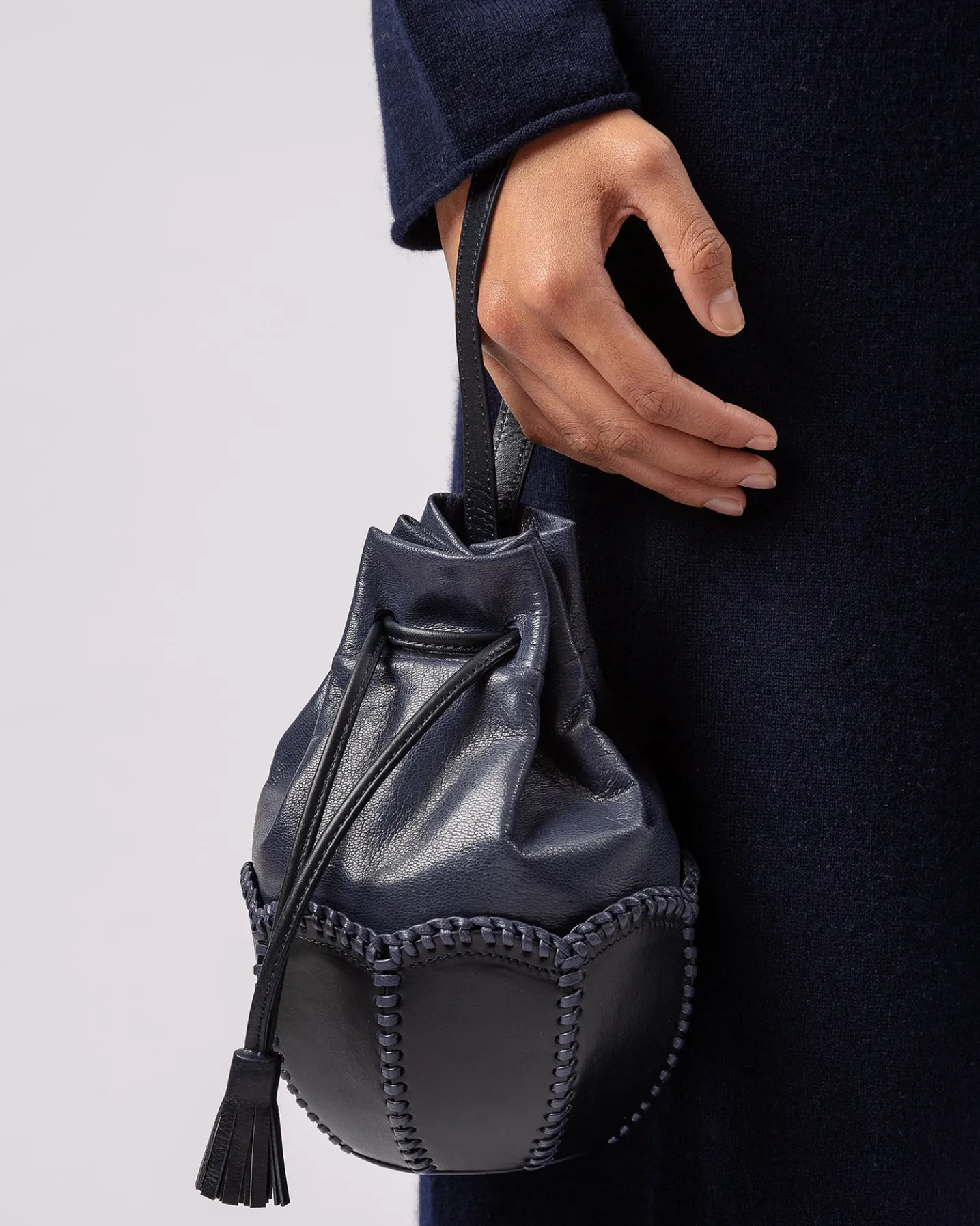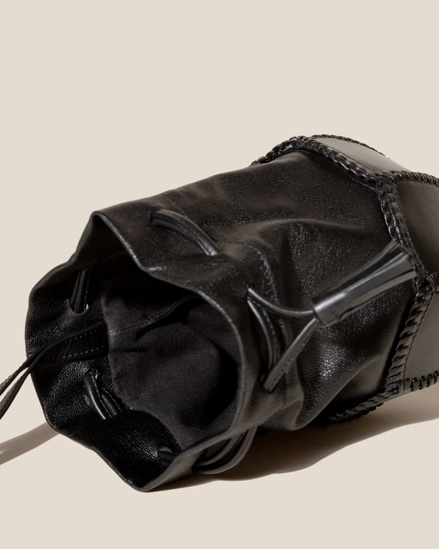 Drawstring pouch with braided seams, crafted in supple shiny lambskin and calf leather.