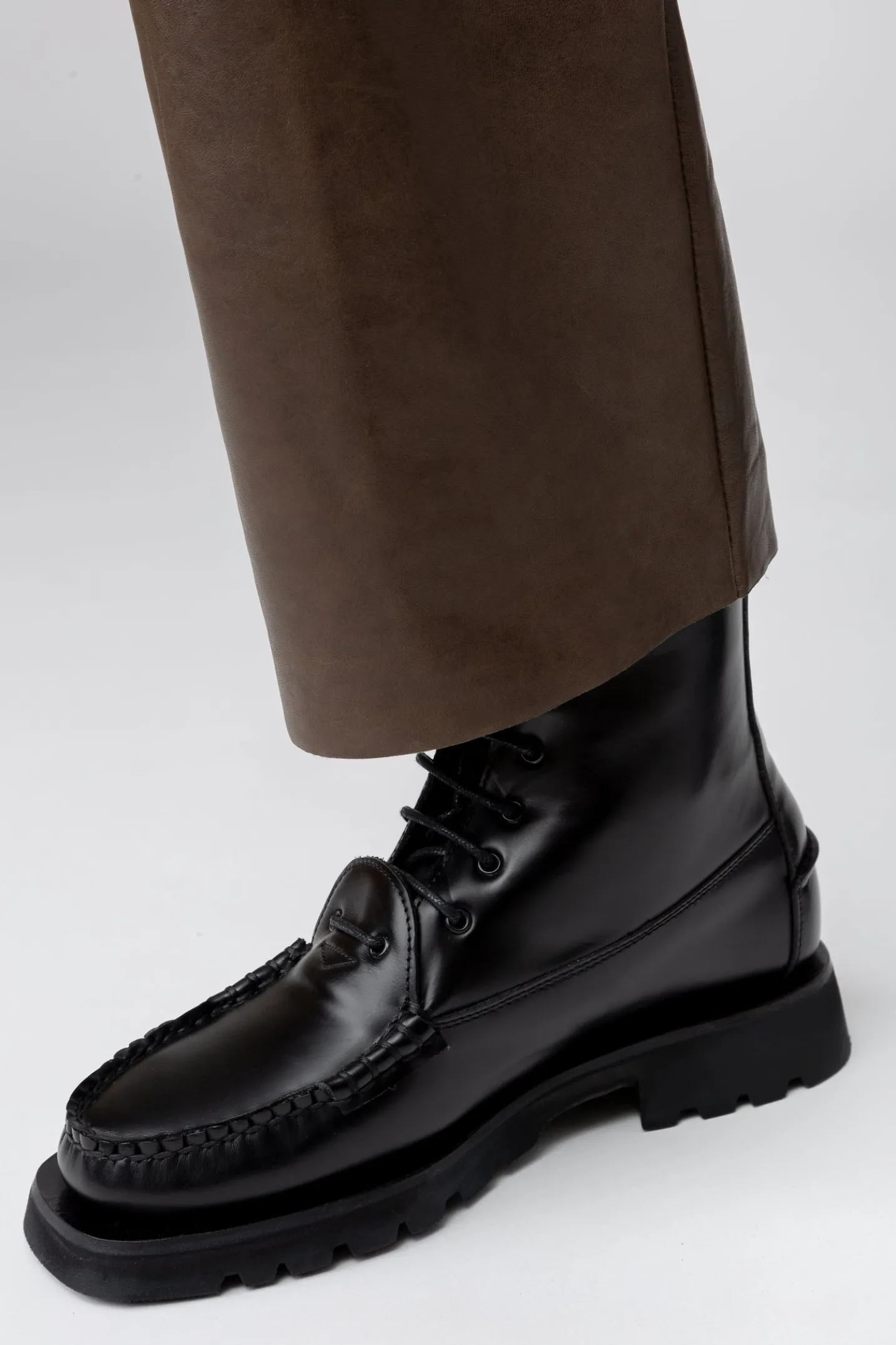 Tread sole lace-up loafer boot crafted in Spanish full-grain calf leather. The upper has been hand sewn using the traditional moccasin construction.