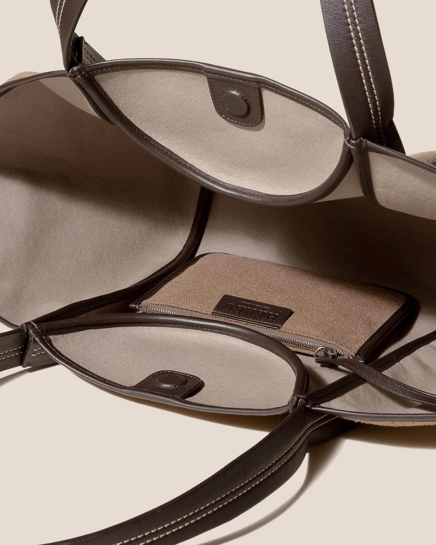 Leather-trimmed canvas basket crafted in thick canvas and soft smooth calf.