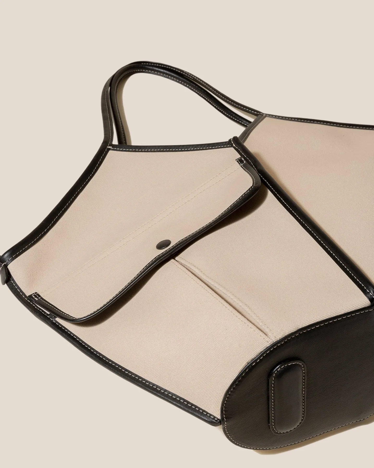 Side-pocket organic cotton tote bag edged with smooth leather. It has a zipped pouch to secure small essentials and slim top handles that sit over the shoulder.