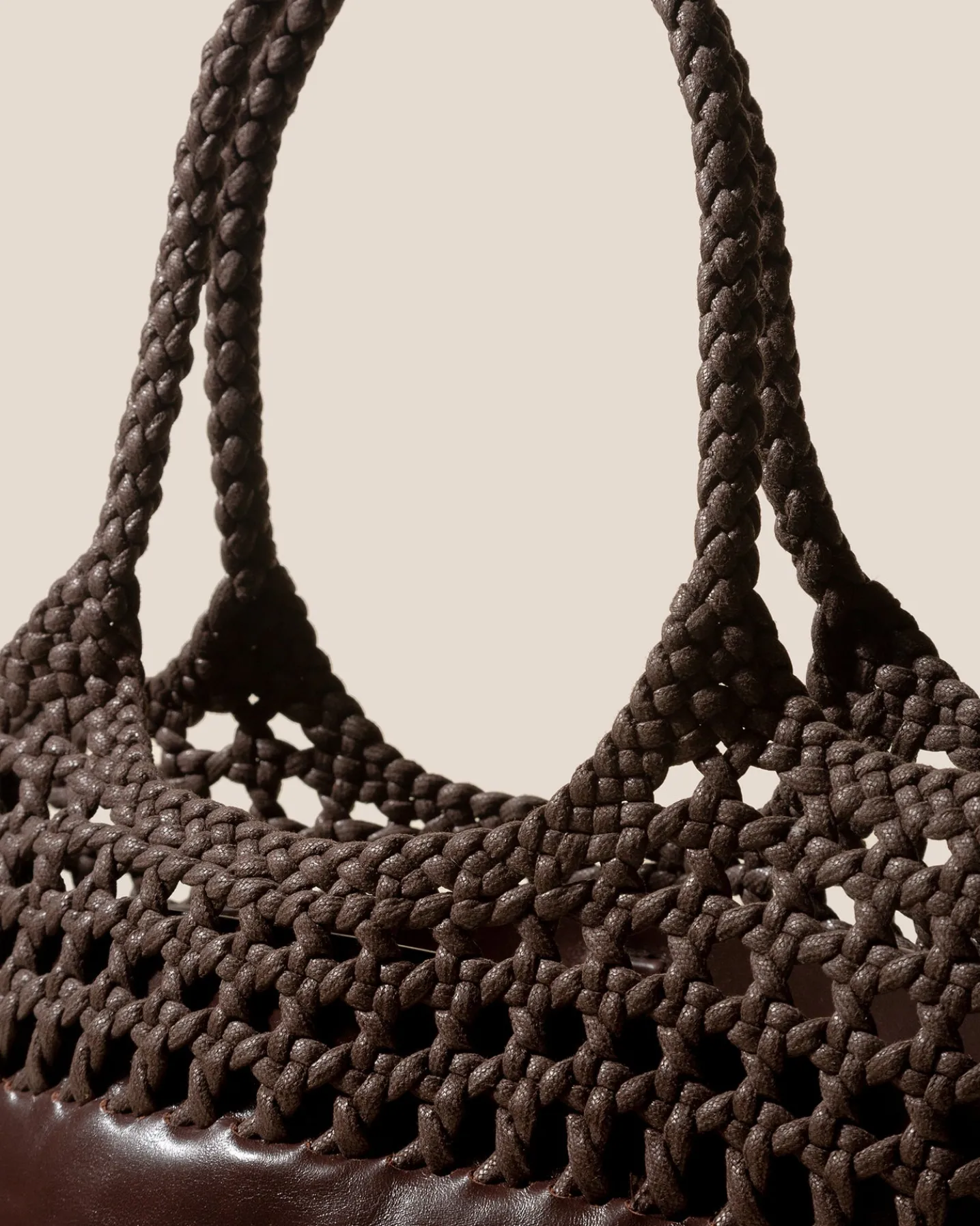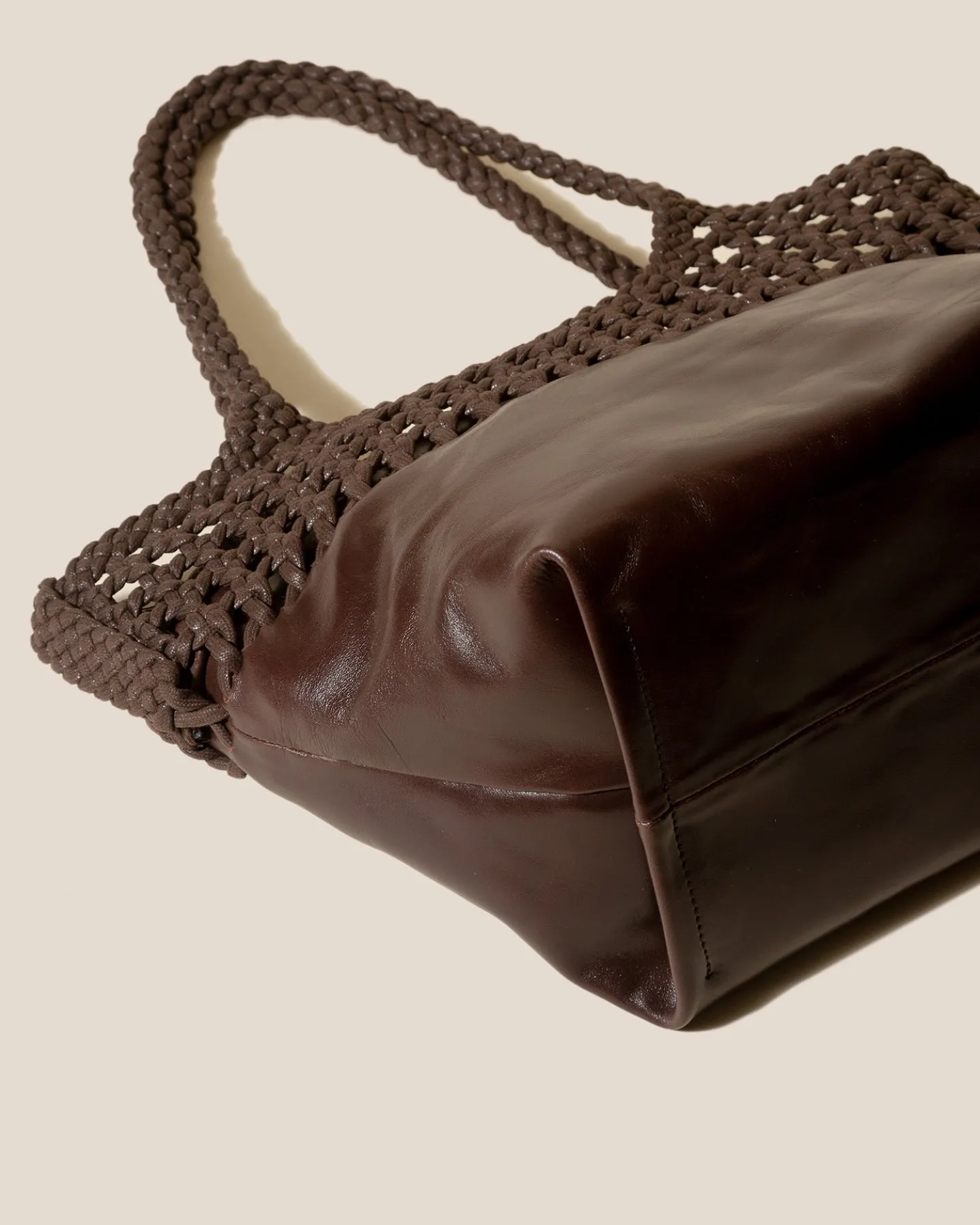 Braidedtopshoulder bag craftedin polished calfleather and waxedcotton.Organic cotton lining.