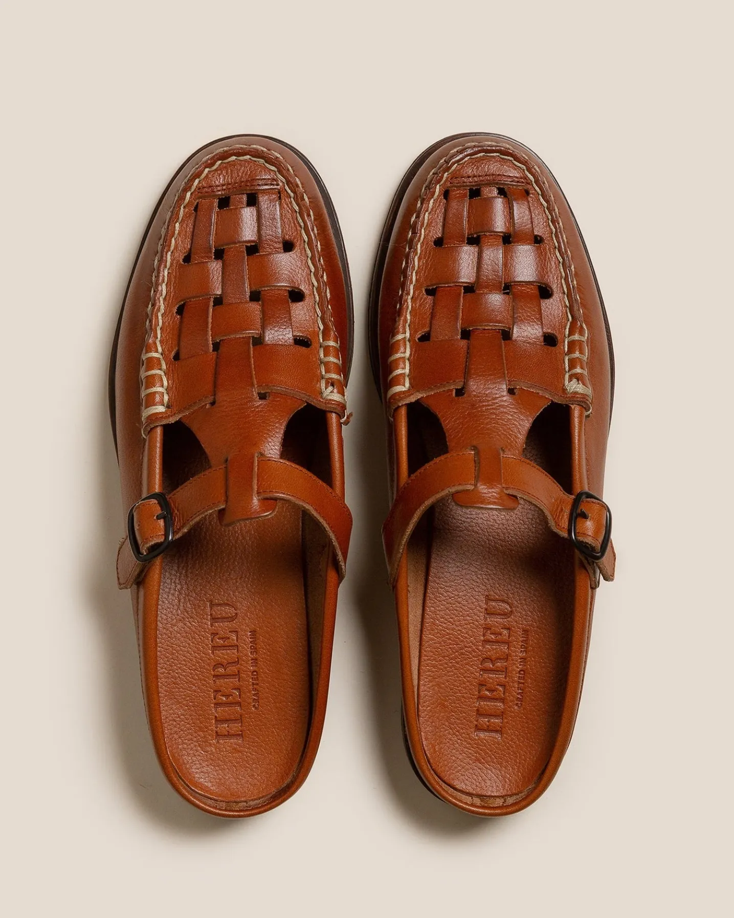 Woven t-bar mule loafer crafted in Spanish grainy veg-tanned calf leather.