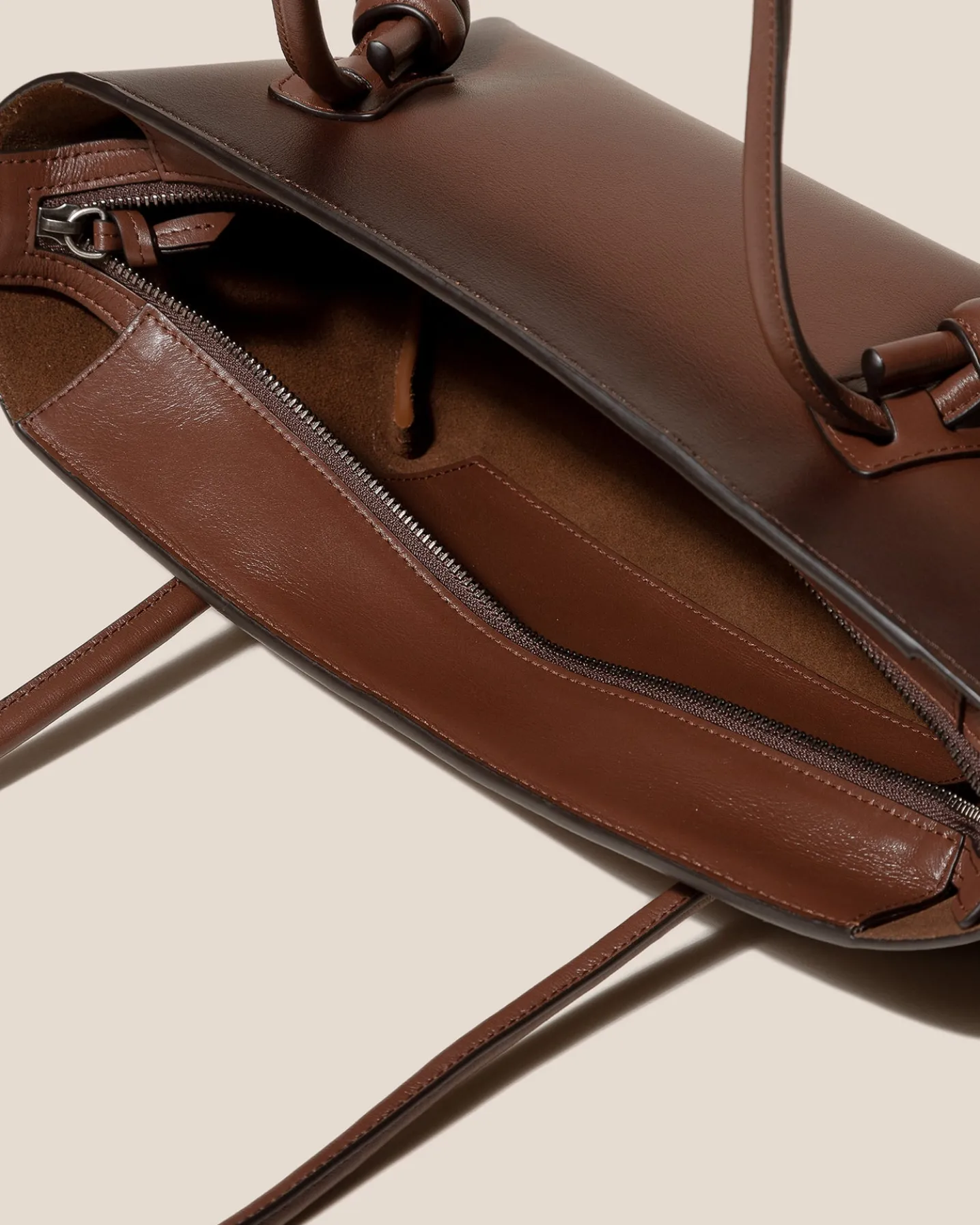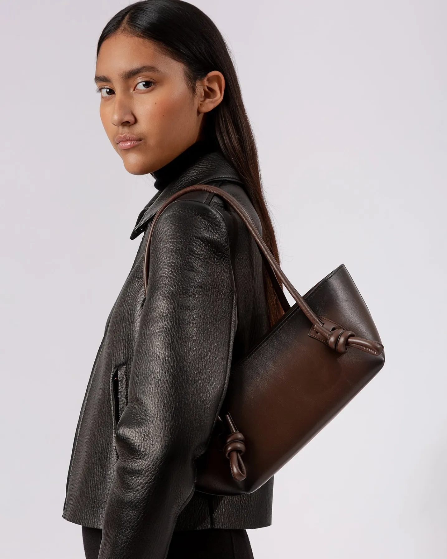 Baguette shoulder bag with knotted handle detail, crafted in sleek calf leather with airbrushed details.