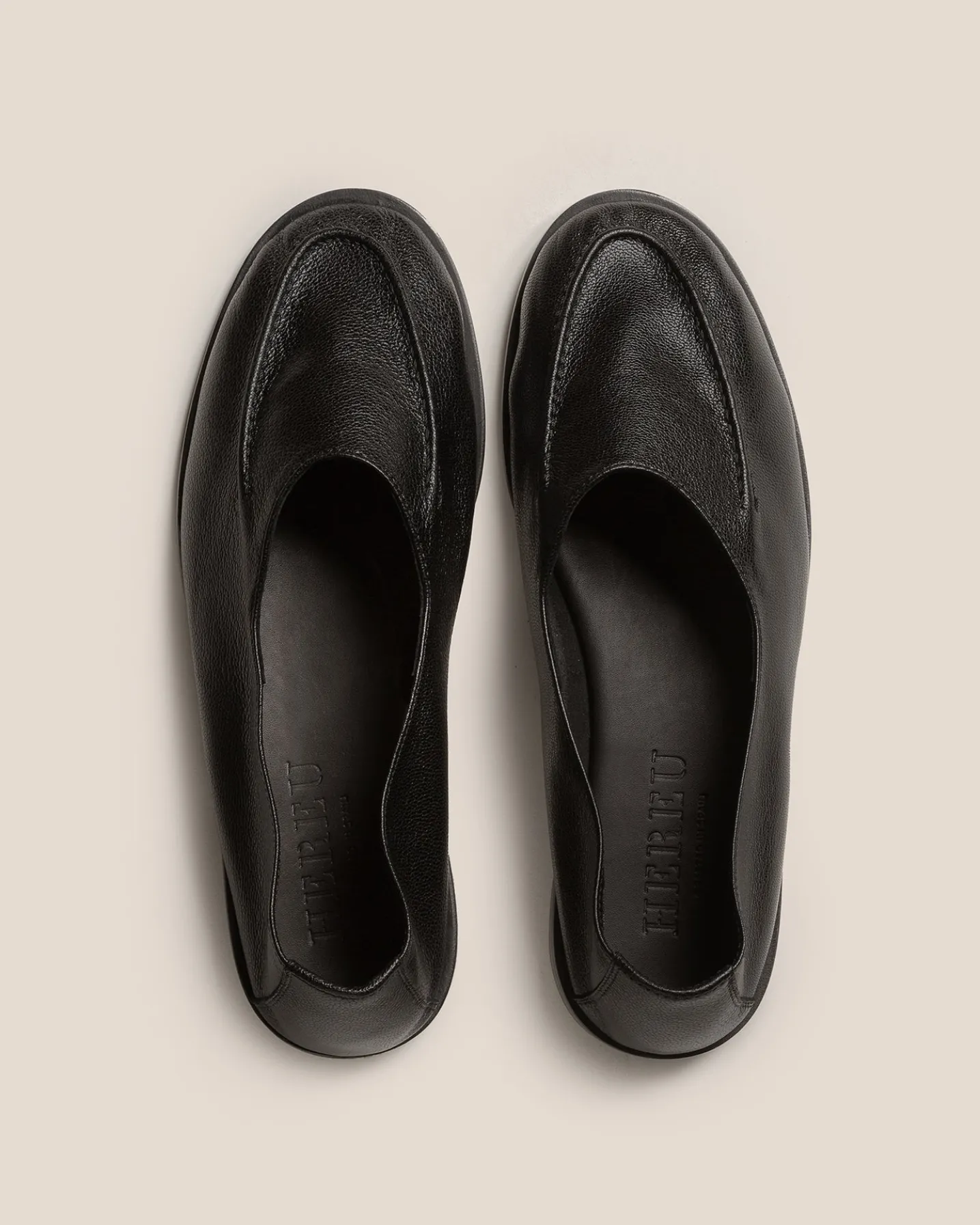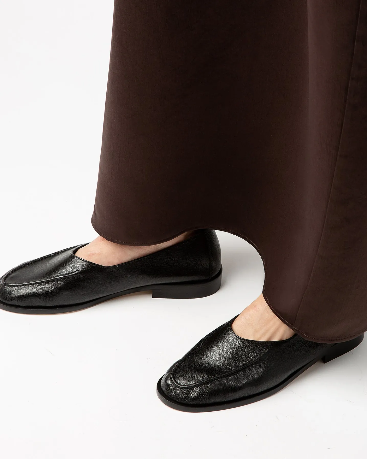 High cut deconstructed loafer with thick sole, crafted in supple shiny lambskin.