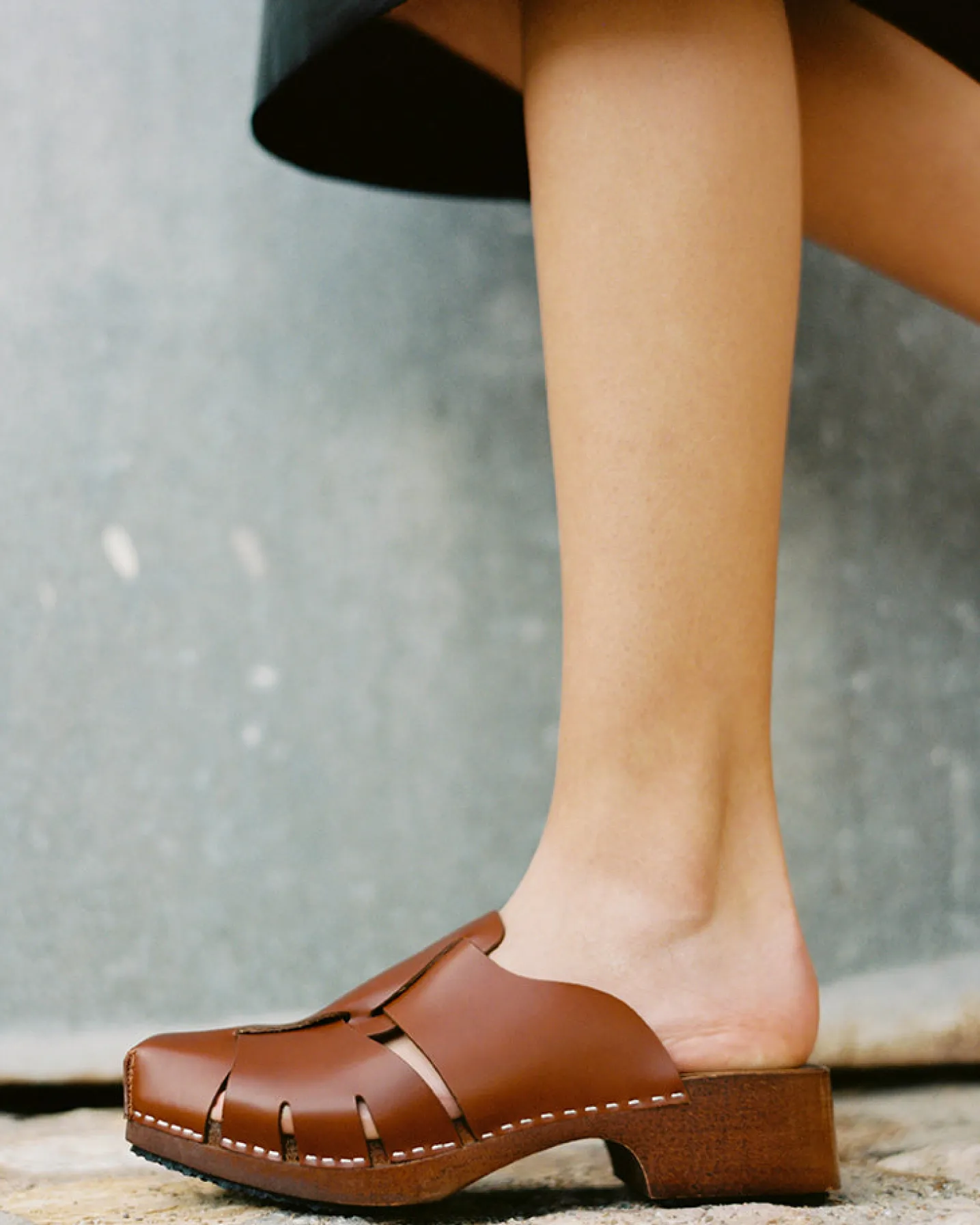 Square toe wooden mule clog with fisherman-sandal details. Crafted in Spanish full-grain leather and hand-carved wooden sole.