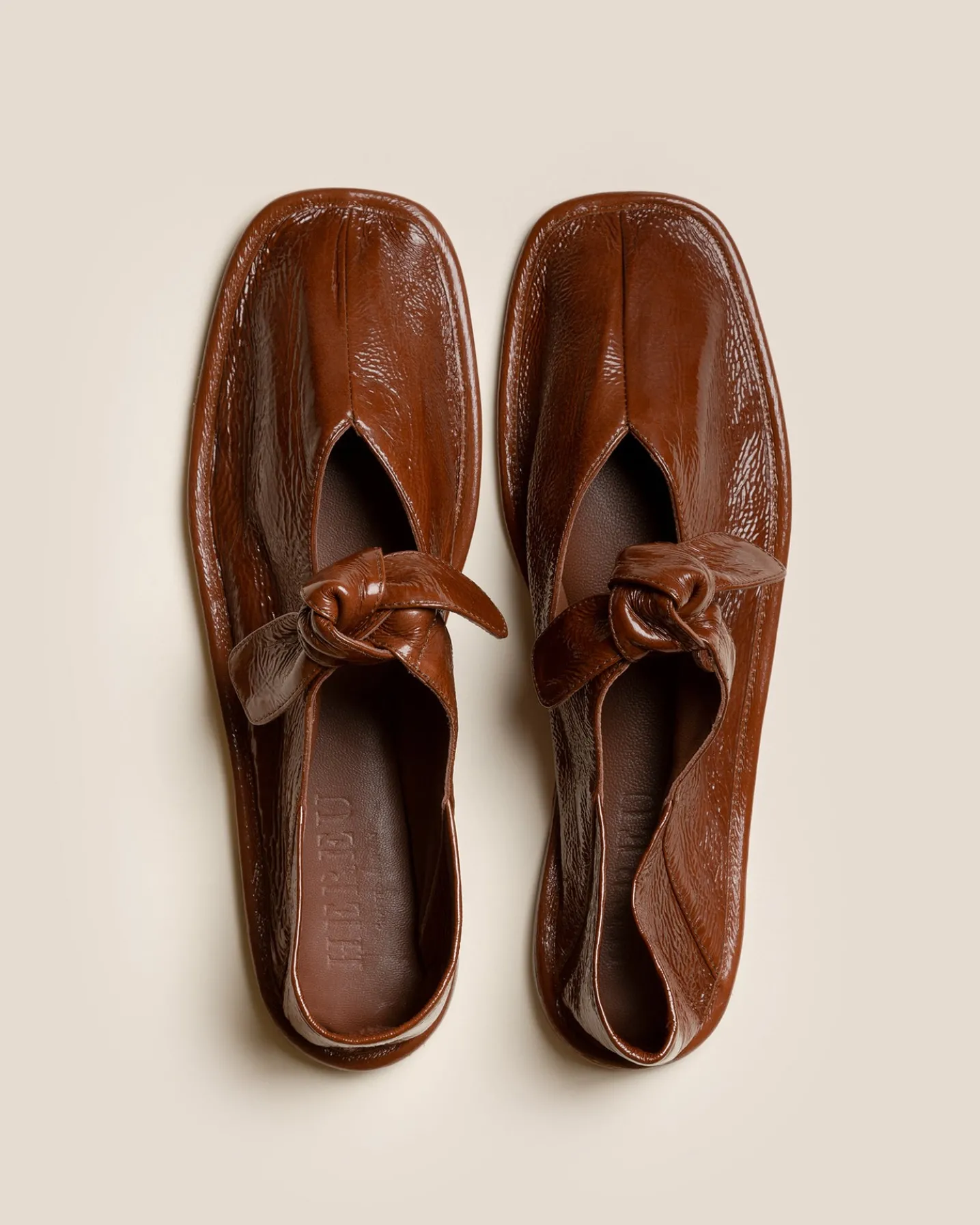 Square toe pump with bow detail, crafted in crinkled glossy lambskin.