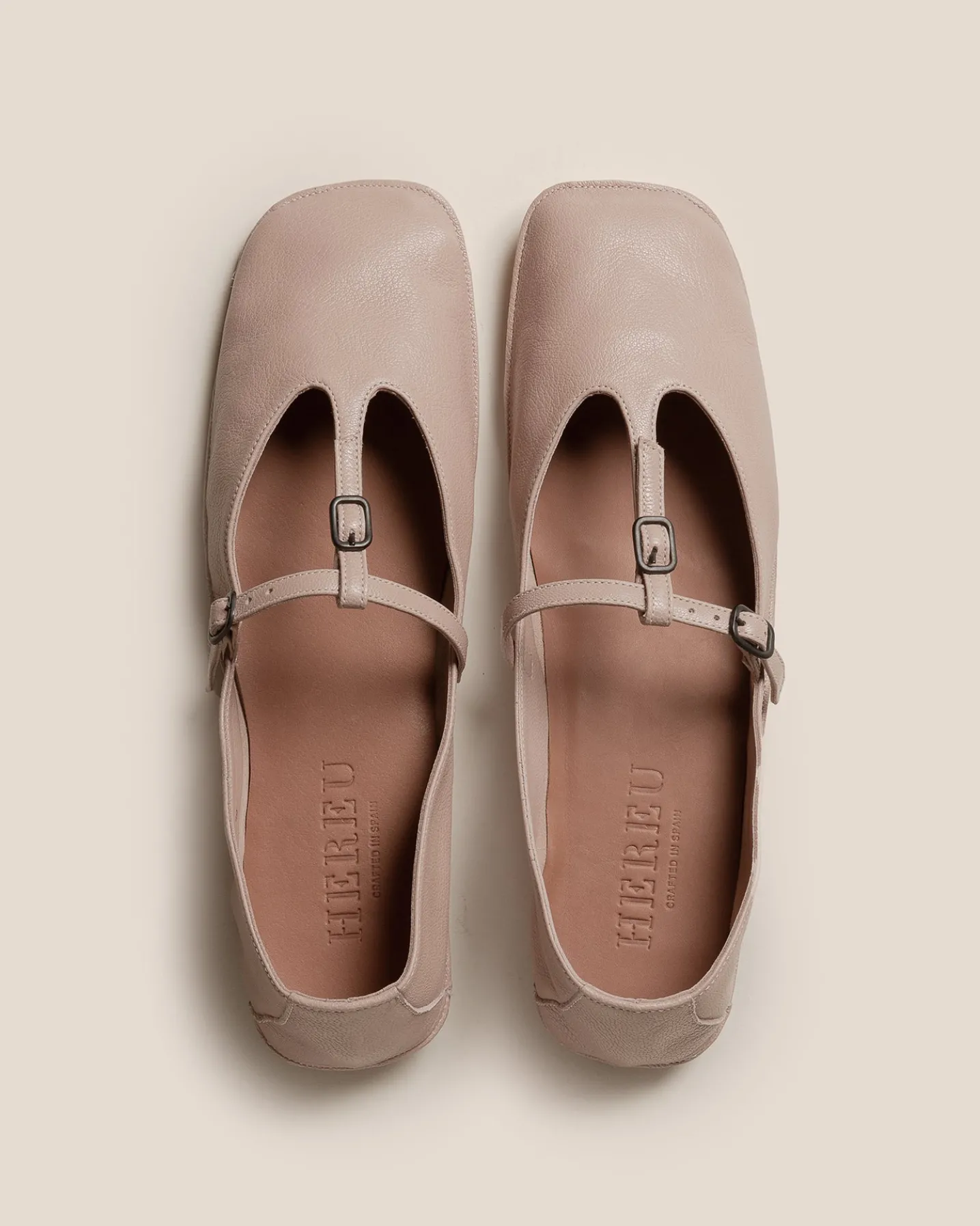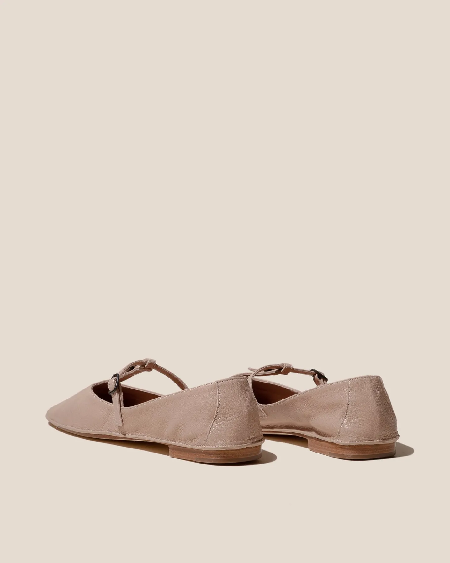 Soft T-bar with buckle detail, crafted in supple shiny lambskin.