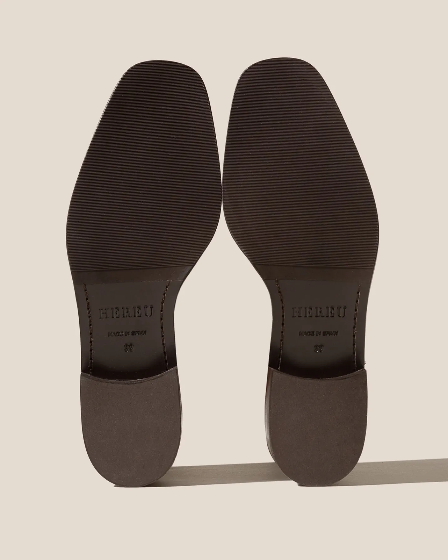 Almond toe mid calf boot with braided details, crafted polished structured calf leather.