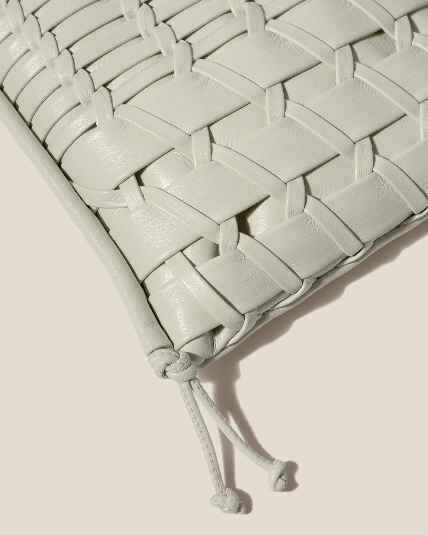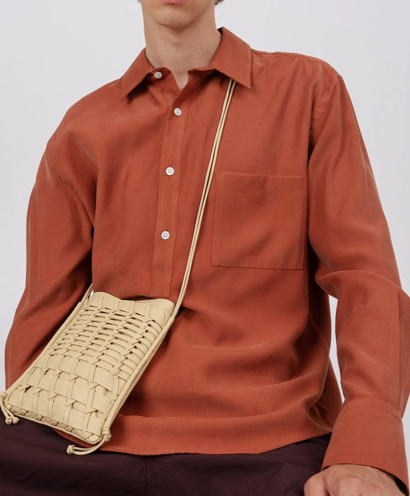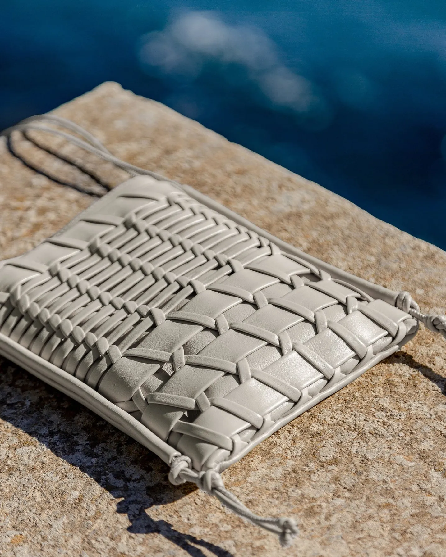 Flat square crossbody bag crafted in soft calf leather, with a handwoven front pocket.